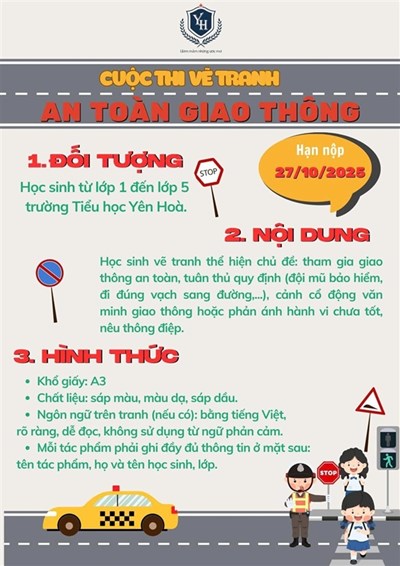 Nhằm nâng cao nhận thức và bồi dưỡng ý thức chấp hành luật giao thông cho học sinh, Trường Tiểu học Yên Hoà phát động cuộc thi vẽ tranh với chủ đề “An toàn giao thông” dành cho tất cả học sinh từ khối 1 đến khối 5.