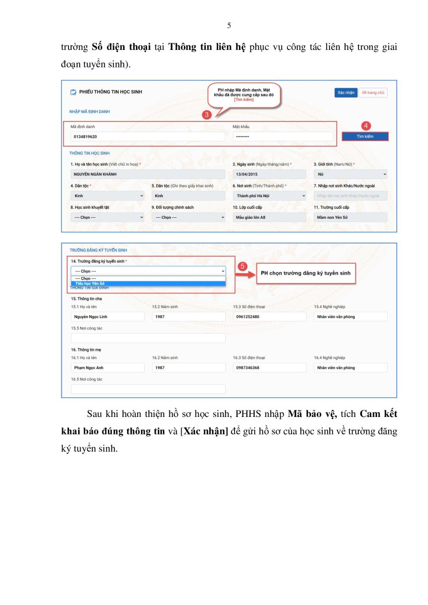 Trường Tiểu học Yên Hòa kính gửi quý phụ huynh "Tài liệu hướng dẫn đăng ký tuyển sinh đầu cấp".