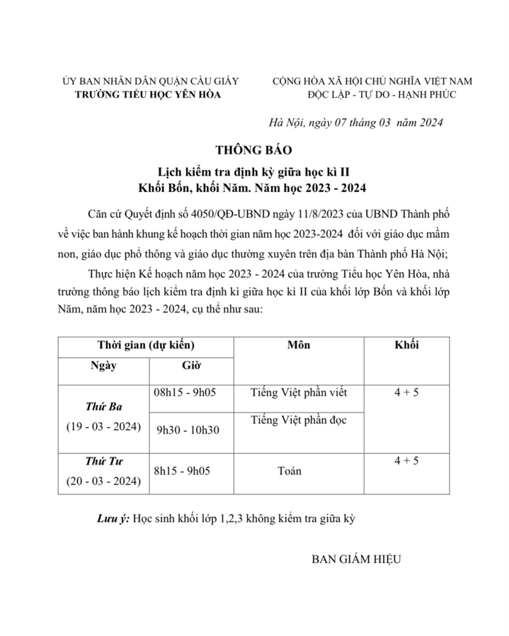 Lịch kiểm tra định kì giữa học kì II đối với khối 4 và khối 5 - Năm học 2023 - 2024
