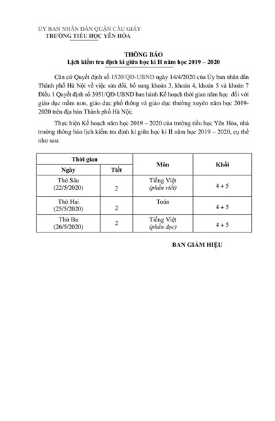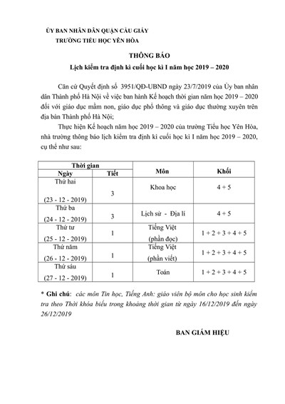 Thực hiện Kế hoạch năm học 2019 – 2020 của trường Tiểu học Yên Hòa, nhà trường thông báo lịch kiểm tra định kì cuối học kì I năm học 2019 – 2020, cụ thể như sau: