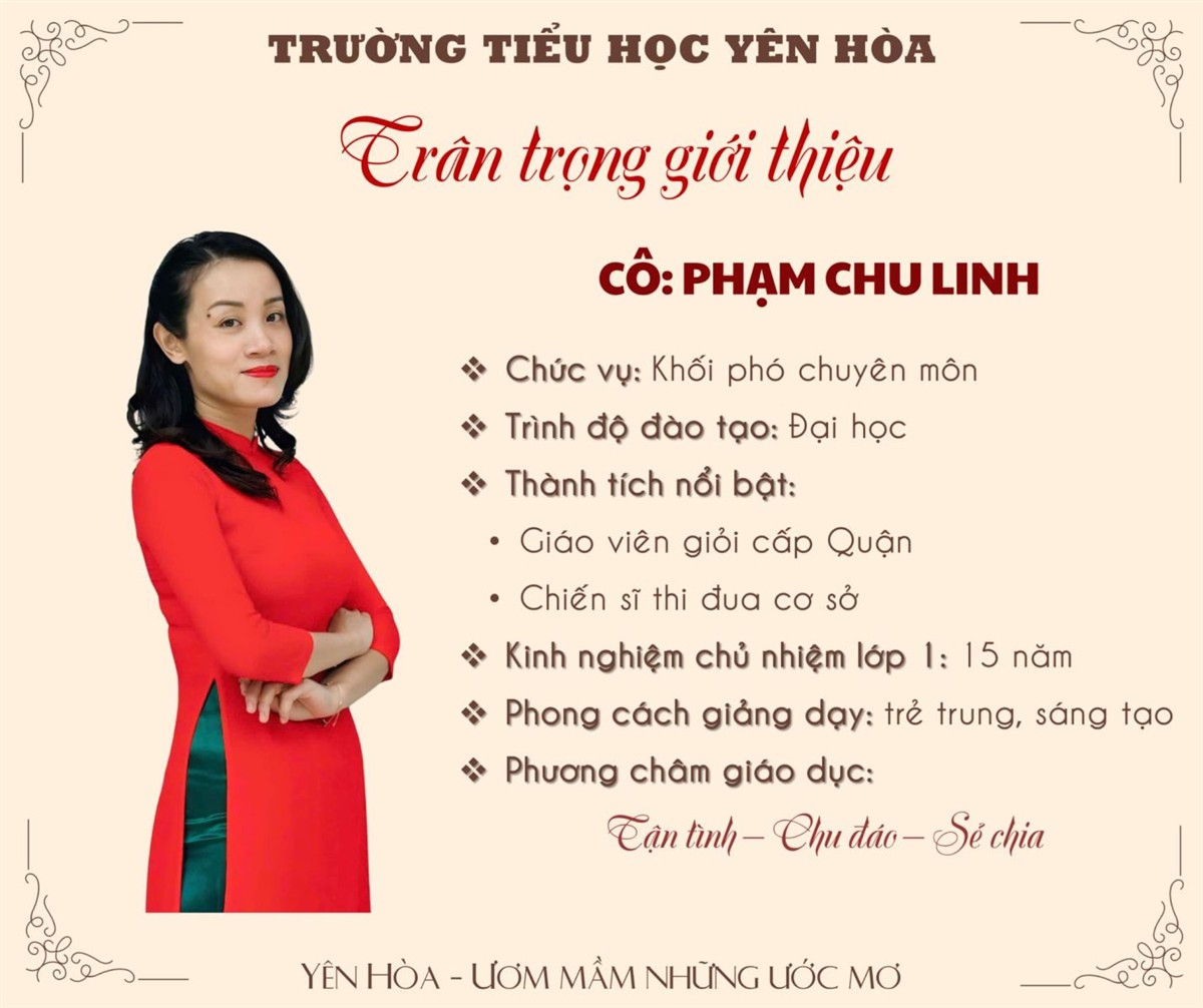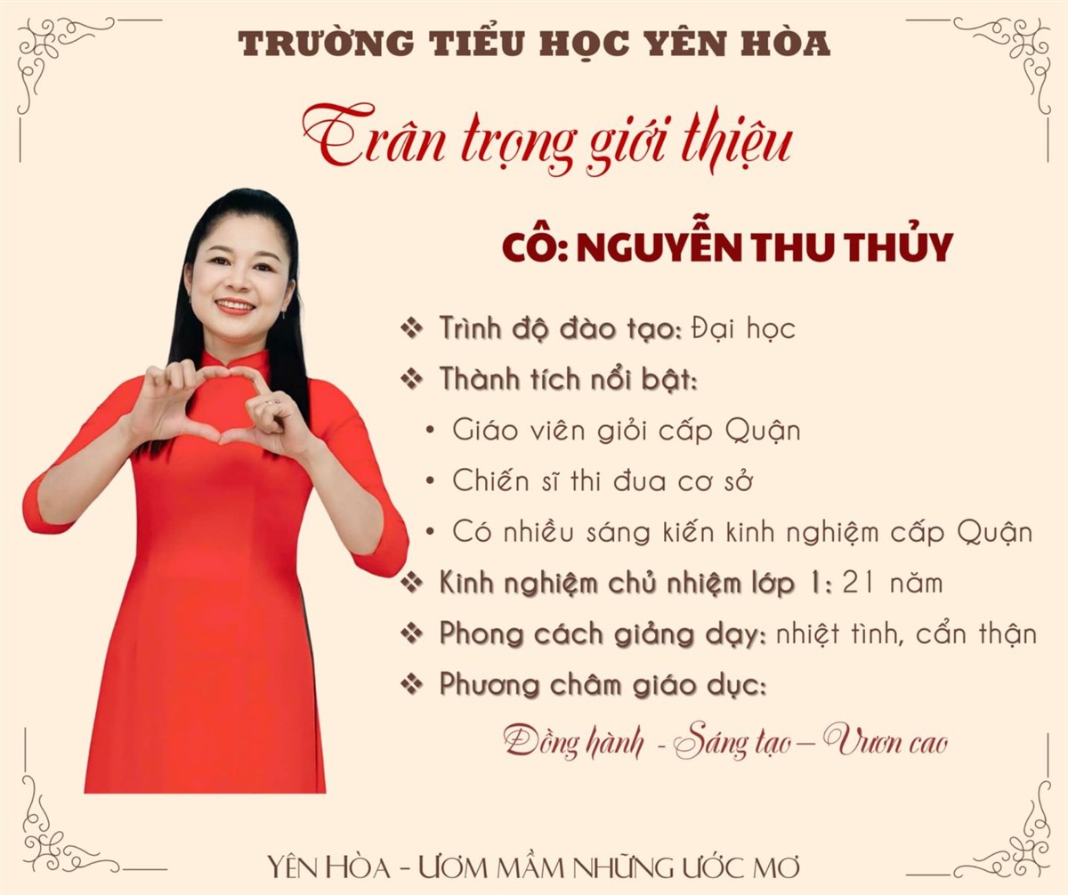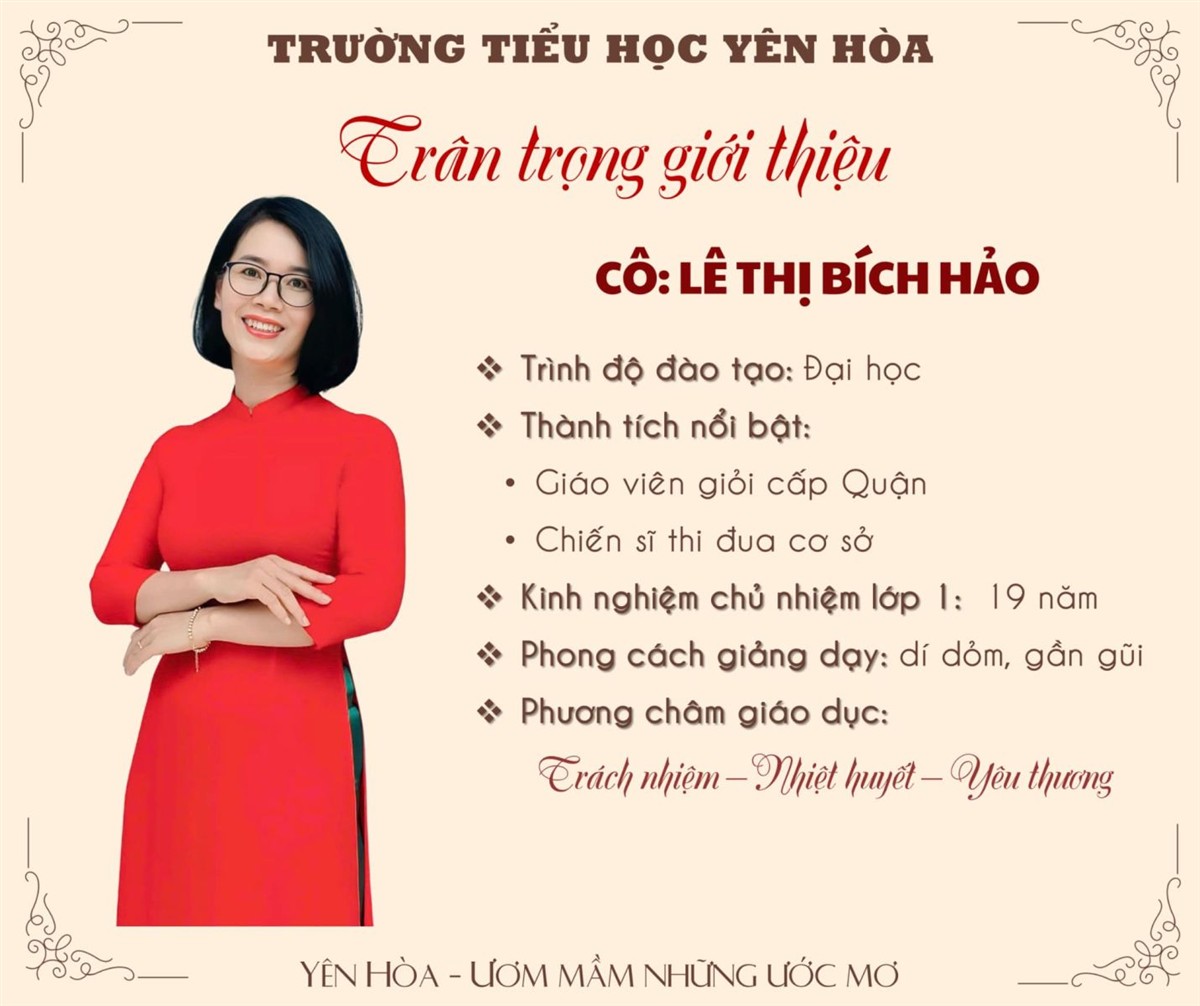 Khối 1 năm học 2024 – 2025 của trường Tiểu học Yên Hòa quy tụ những giáo viên tâm huyết, sáng tạo, đạt chuẩn trình độ đào tạo, là giáo viên giỏi các cấp và đặc biệt là đã có kinh nghiệm làm công tác chủ nhiệm lớp 1 lâu năm nên các cô luôn thấu hiểu tâm lí của học trò nhỏ và có những phương pháp vô cùng hiệu quả trong việc dạy học cũng như rèn nề nếp cho các con.