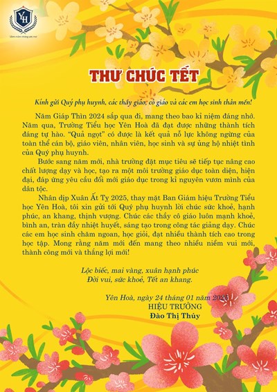 Trong không khí hân hoan đón chào xuân mới - Xuân Ất Tỵ , trân trọng gửi đến tất cả các bậc phụ huynh, các thầy cô giáo và các em học sinh "THƯ CHÚC TẾT" của cô Đào Thị Thúy - Bí thư Chi bộ, Hiệu trưởng trường Tiểu học Yên Hòa.