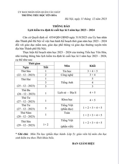 Chúc cho trường Tiểu học Yên Hòa đạt nhiều thành tích cao trong học kì II, hoàn thành xuất sắc nhiệm vụ năm học 2023 – 2024.