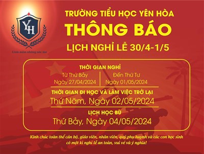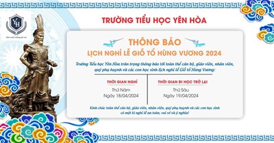 Trường Tiểu học Yên Hoà trân trọng thông báo Lịch nghỉ lễ Giỗ tổ Hùng Vương.