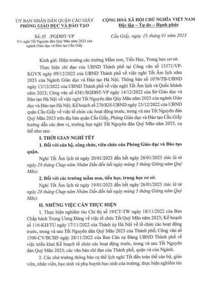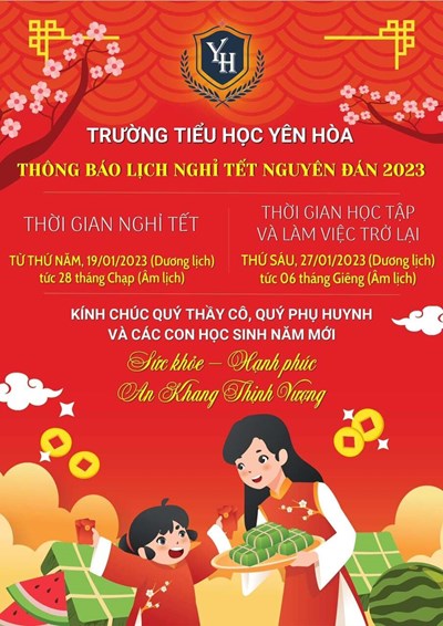 Trường Tiểu học Yên Hoà kính gửi quý phụ huynh và các em học sinh lịch nghỉ Tết Nguyên Đán 2023