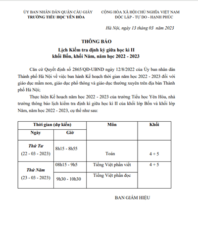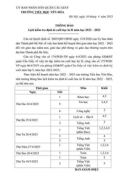 Thực hiện Kế hoạch năm học 2022 - 2023 của trường Tiểu học Yên Hòa, nhà trường thông báo lịch kiểm tra định kì cuối học kì I năm học 2022 - 20223, cụ thể như sau: