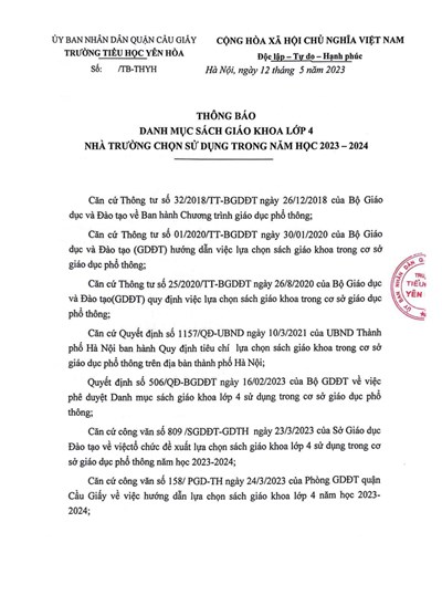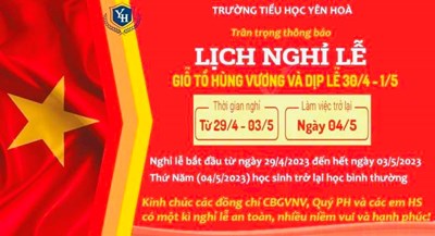 Trường Tiểu học Yên Hoà trân trọng thông báo Lịch nghỉ lễ Giỗ Tổ Hùng Vương và 30/4 - 1/5.