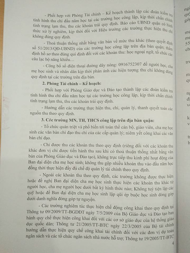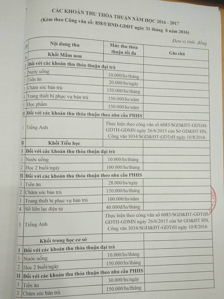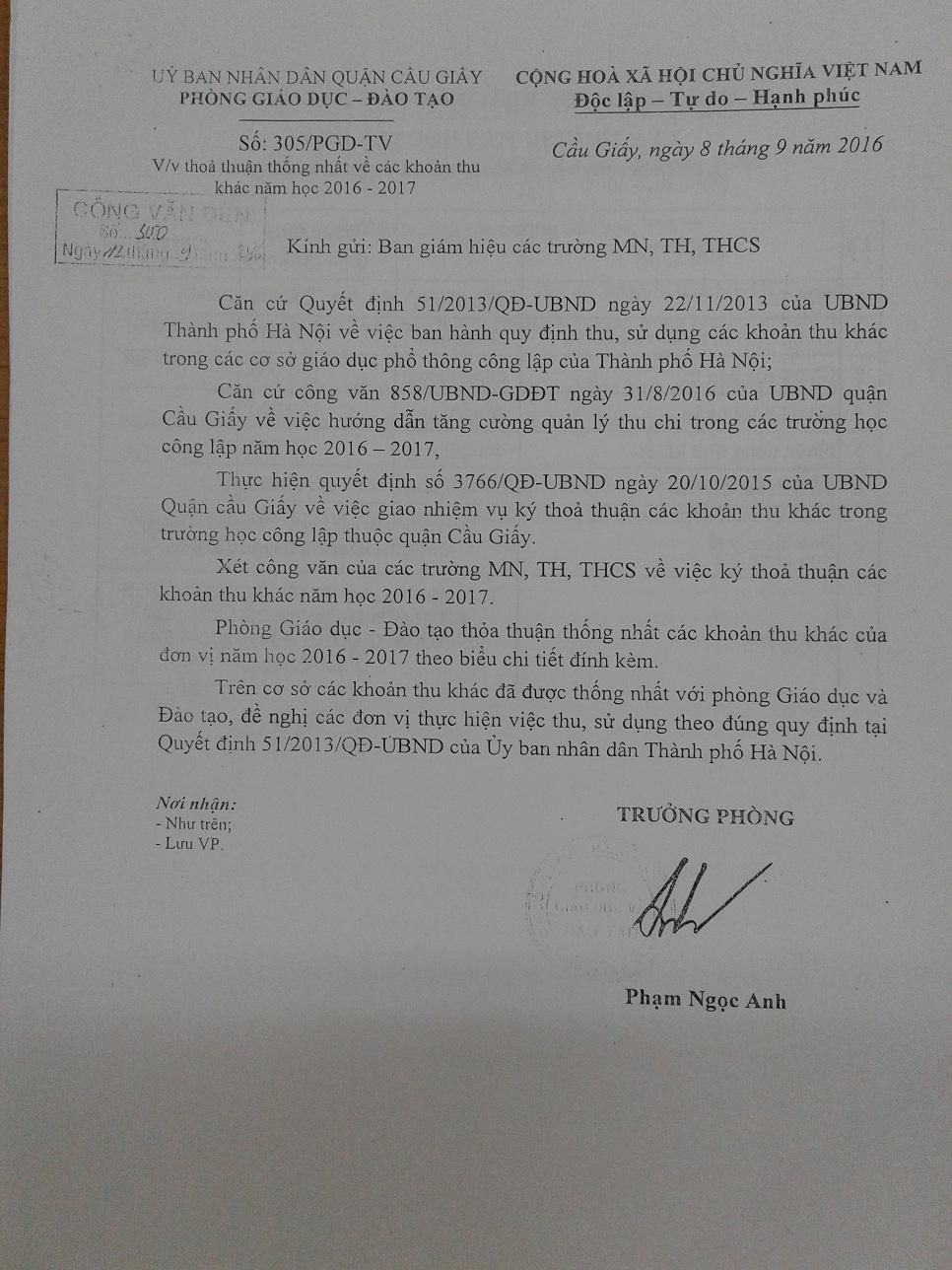 Công Văn số 305/PGD-TV về việc thỏa thuận thống nhất các khoản thu khác năm học 2016 – 2017