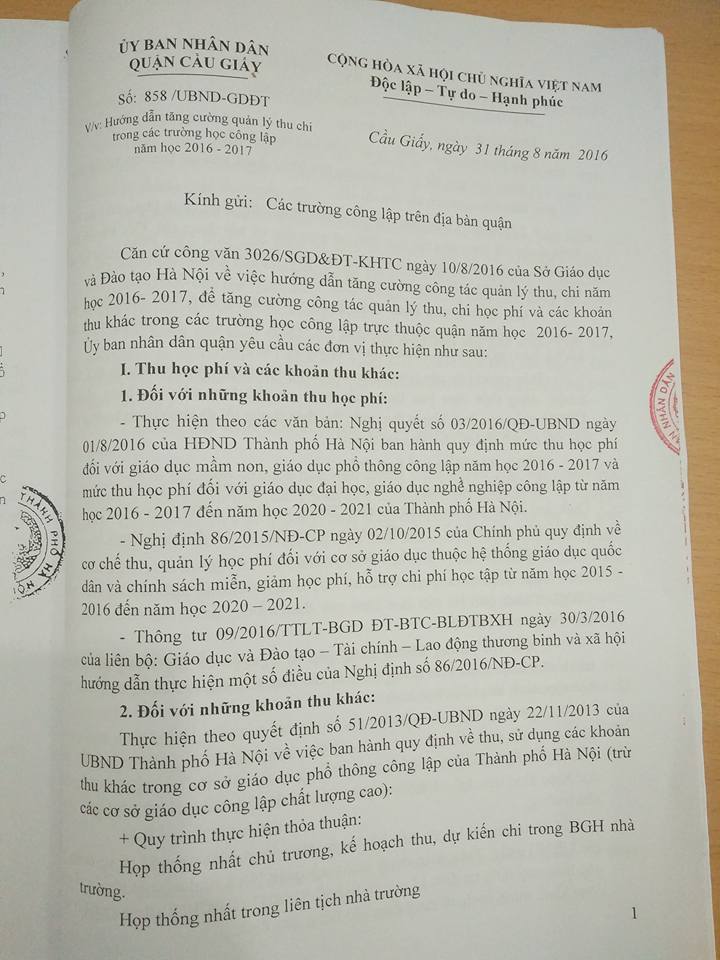 Công văn số 858/UBND-GDĐT V/v Hướng dẫn tăng cường quản lý thu chi trong các trường học công lập năm học 2016 – 2017.