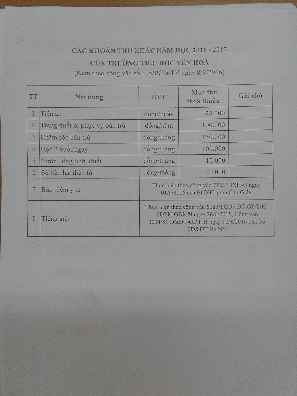 Căn cứ công văn số 858/UBND-GDĐT ngày 31/8/2016 hướng dẫn thu, chi năm học 2016 – 2017; trường Tiểu học Yên Hoà thông báo dự kiến các khoản thu, chi năm học 2016 – 2017 tới toàn thể CMHS.Thông báo dự kiến thu chi 16-17