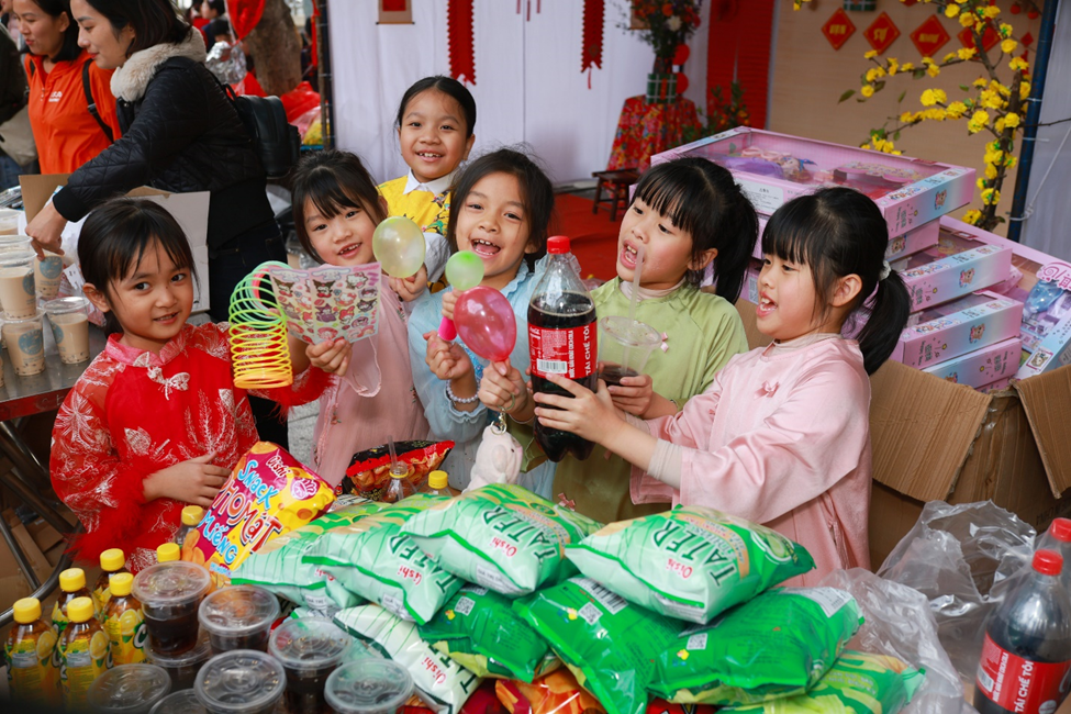 Các bạn nhỏ không giấu được niềm vui khi được hòa mình vào không khí ấm áp của phiên chợ Tết.