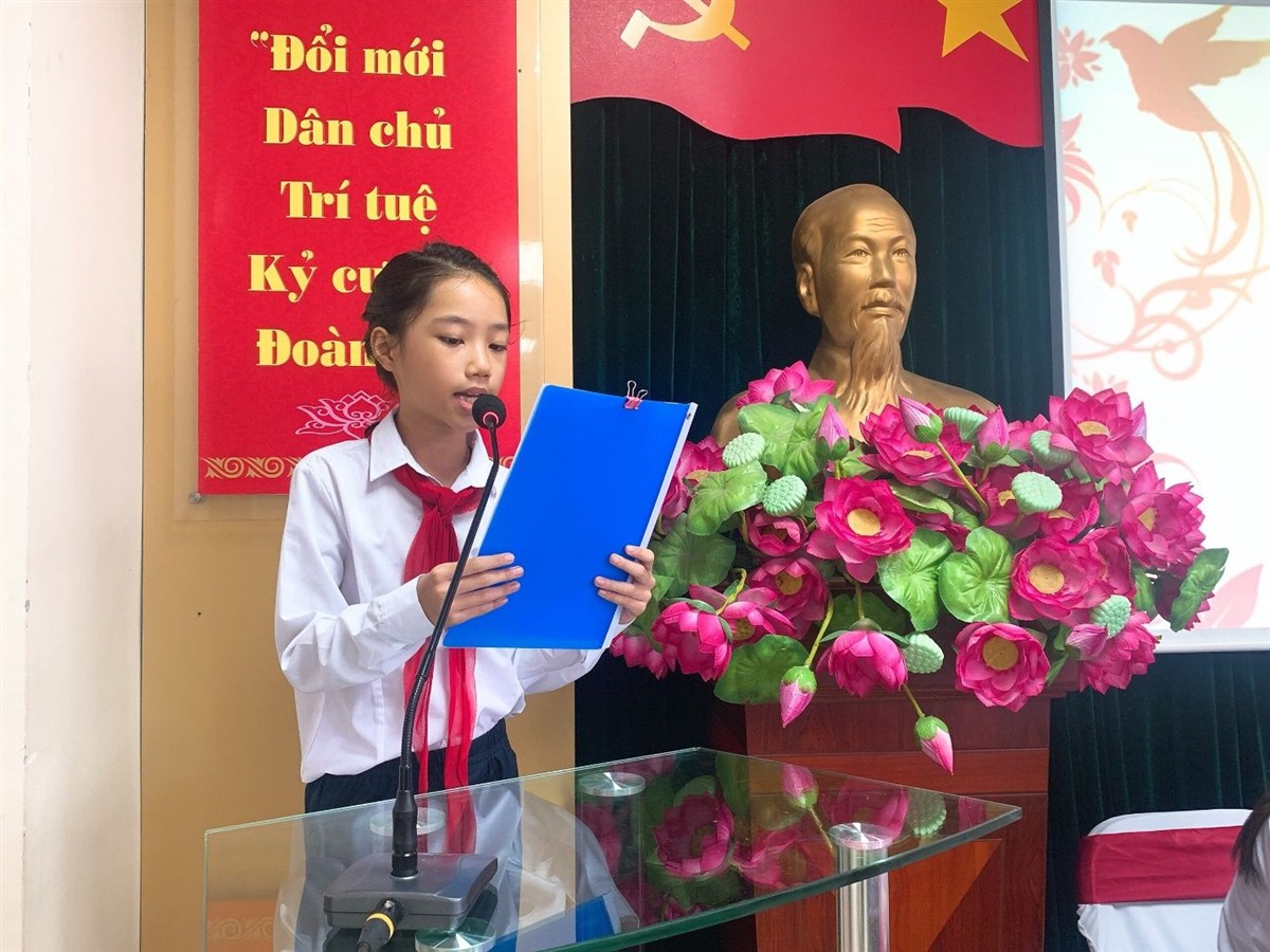 Bạn Phạm Trà My chi đội 5A thay mặt Đoàn chủ tịch phát biểu và giới thiệu Thư ký Đại hội