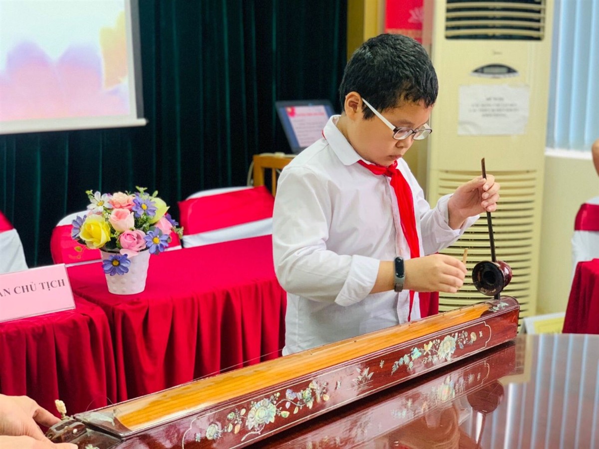 Tiết mục độc tấu đàn bầu đặc sắc của bạn Lưu Tùng Tâm – chi đội 5G khiến không khí tại đại hội thêm phần hào hứng sôi nổi.