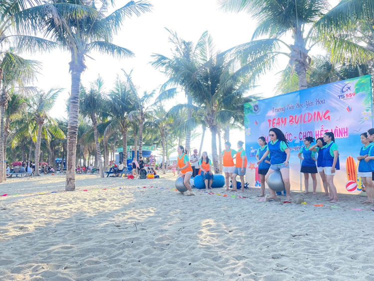 Hành trình khám phá Hạ Long đưa đoàn đến với những trải nghiệm vui vẻ trên bờ biển dài và các hoạt động Team building “Làm hết sức – Chơi hết mình” sôi nổi trên bãi biển.
