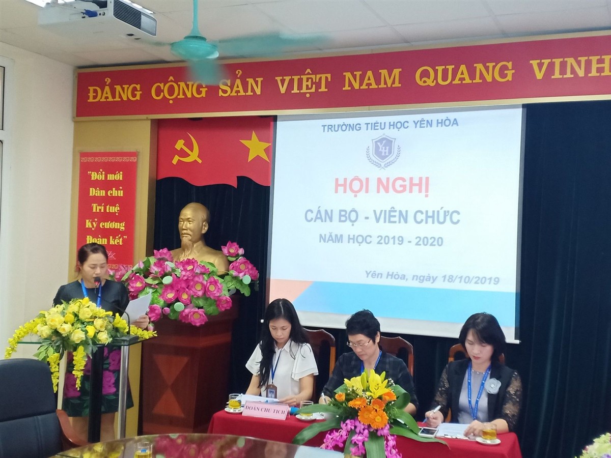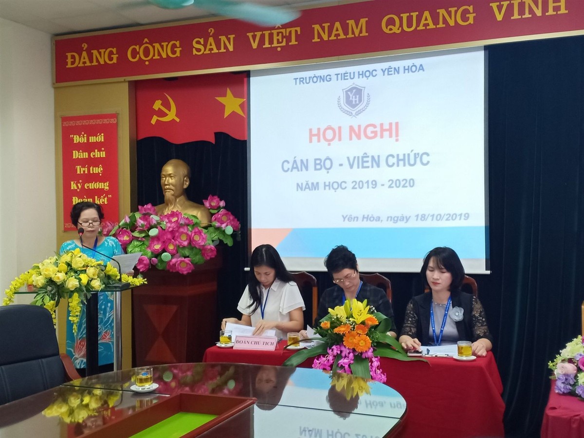 Hòa trong niềm vui hân hoan của năm học mới, năm học với chủ đề “Đổi mới căn bản – toàn diện giáo dục và đào tạo”, toàn Ngành giáo dục tiếp tục thực hiện 3 cuộc vận động lớn và triển khai phong trào thi đua “Xây dựng trường học hạnh phúc”. Sáng ngày 18 tháng 10 năm 2019 trường Tiểu học Yên Hòa long trọng tổ chức Hội nghị cán bộ, công chức, viên chức năm học 2019 – 2020 nhằm đánh giá quá trình hoạt động của toàn trường trong năm học qua đồng thời bàn về các giải pháp thực hiện một số chỉ tiêu, kế hoạch năm học 2019 - 2029