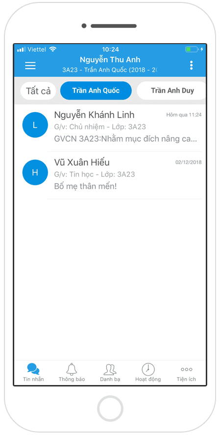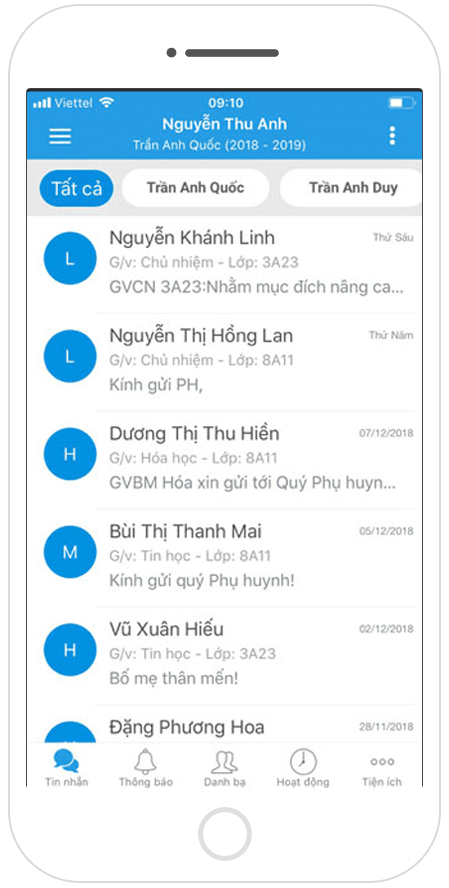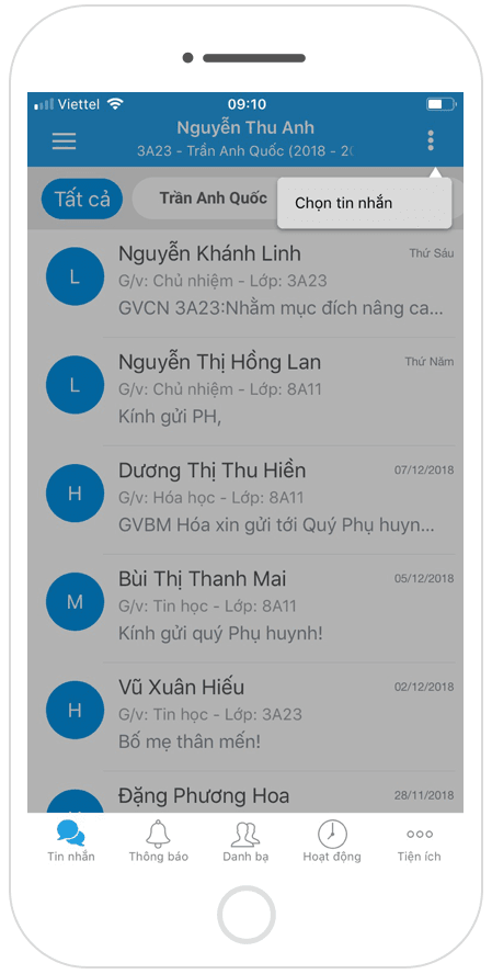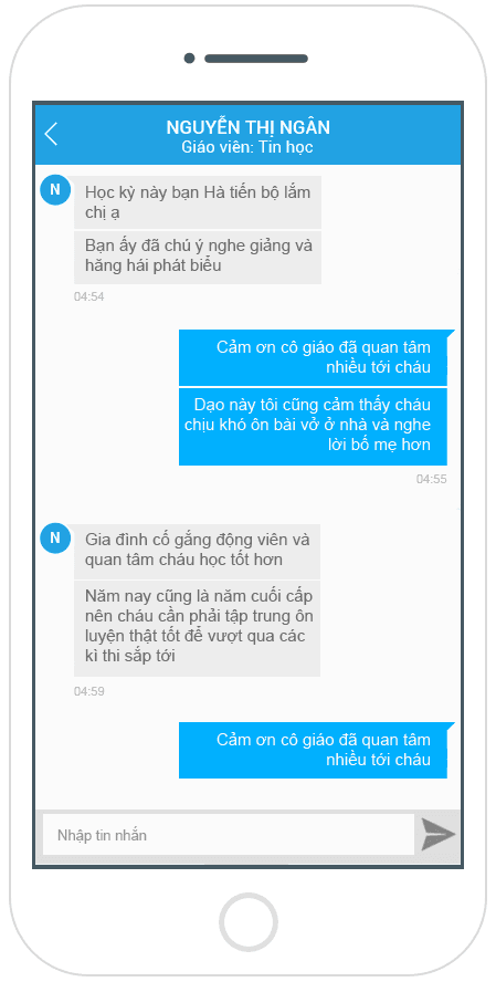 Giao diện hiển thị toàn bộ tin nhắn chát trực tuyến với các giáo viên giảng dạy, các phụ huynh của học sinh cùng lớp của con mình. Đây là những tin nhắn với những thành viên bạn đã từng trò chuyện hoặc nhận tin nhắn mới từ các thành viên trong danh bạ.