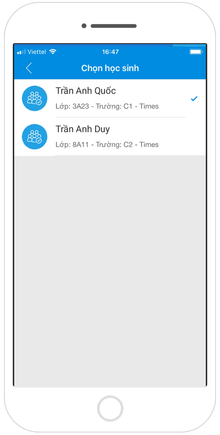• Bấm vào dòng Chọn học sinh, màn hình chọn học sinh hiển thị cho chọn con tiếp theo.