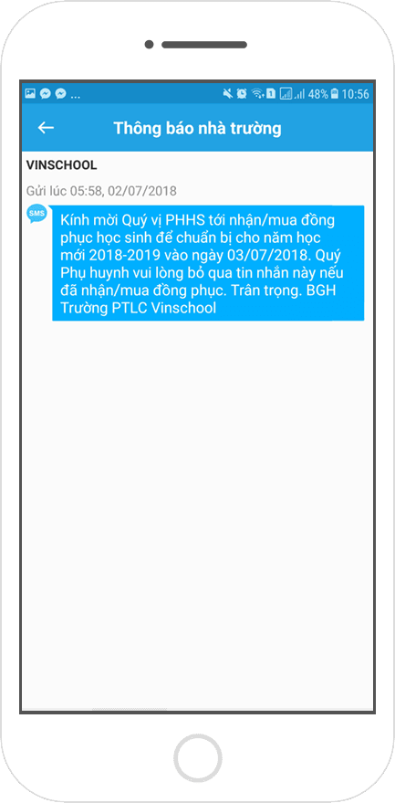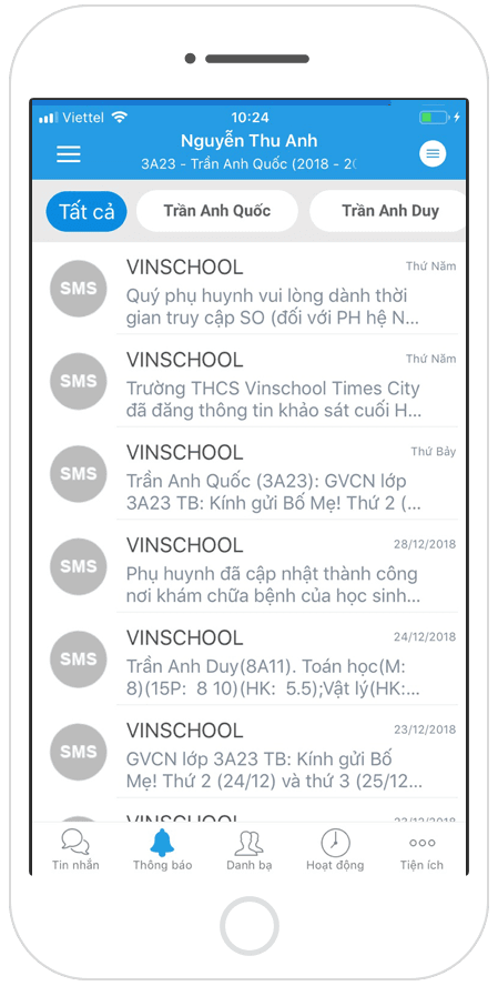 Hiển thị toàn bộ thông báo nhà trường gửi với thông tin người gửi là tên thương hiệu của nhà trường và nội dung thông báo hiển thị có dấu tiếng việt. Giúp phụ huynh xem được thông tin hàng ngày về kết quả học tập, rèn luyện, ý thức đạo đức của con trên lớp.