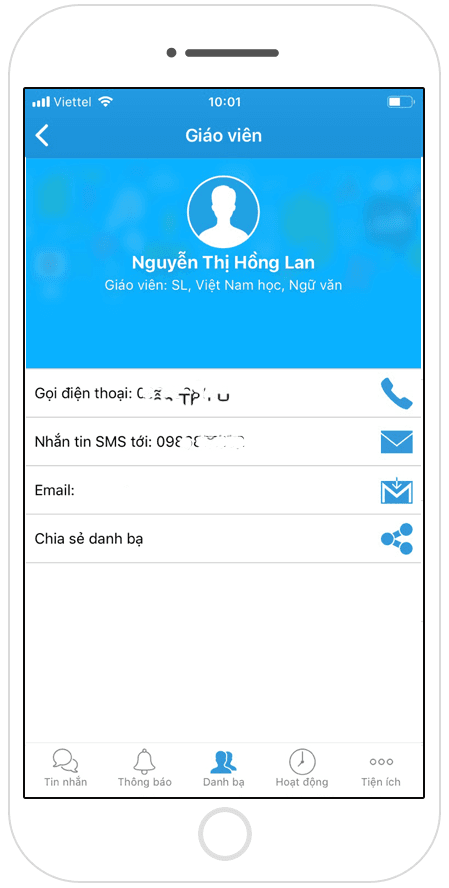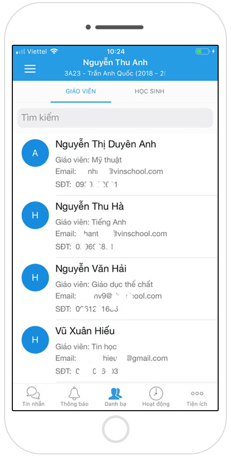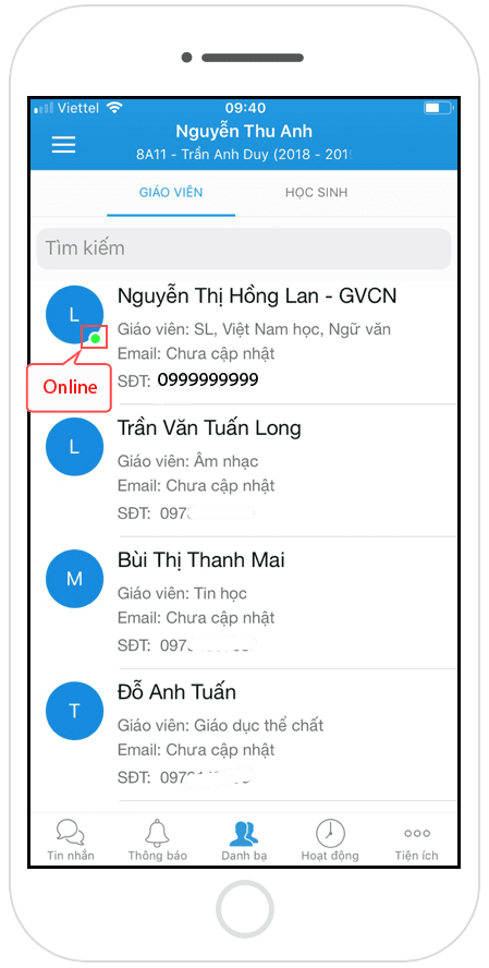 Giúp phụ huynh có được chi tiết danh sách các giáo viên, phụ huynh trong lớp. Chức năng này hỗ trợ phụ huynh gửi tin nhắn miễn phí, trò chuyện trực tuyến với giáo viên về tình hình học tập của học sinh tại trường, gọi điện nói chuyện trực tuyến, chia sẻ danh bạ tới các thành viên trong danh sách.