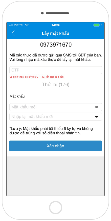 Kiểm tra điên thoại để nhận lại mã OTP. Sau đó bạn nhập mã OTP và mật khẩu mới vào màn hình dưới đây: