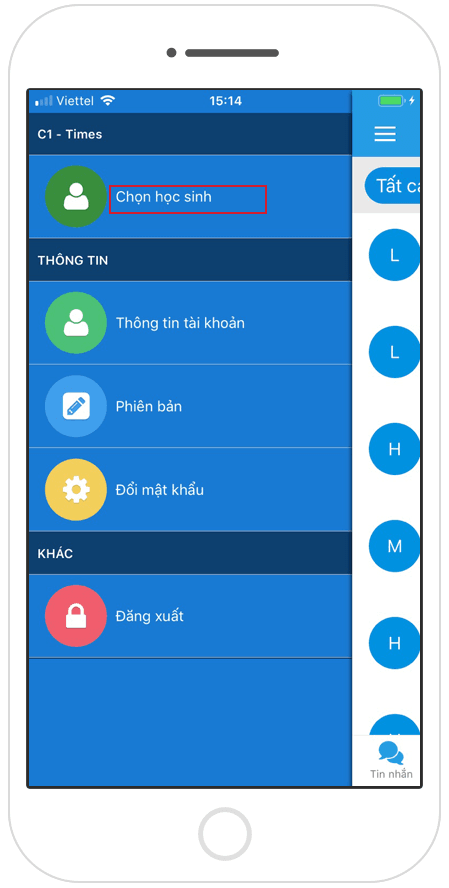 • Đăng nhập tài khoản thành công. Sau khi chọn học sinh xong bạn bấm vào biểu tượng 3 gạch ngang phía trên bên trái màn hình