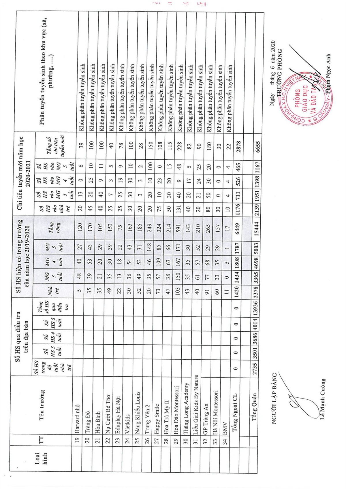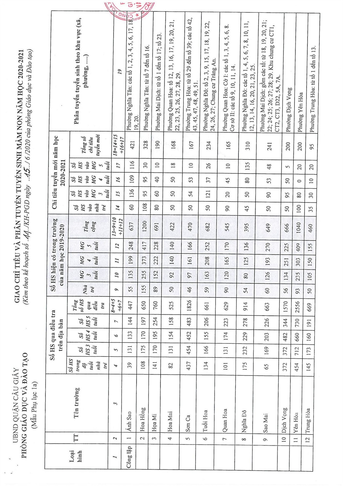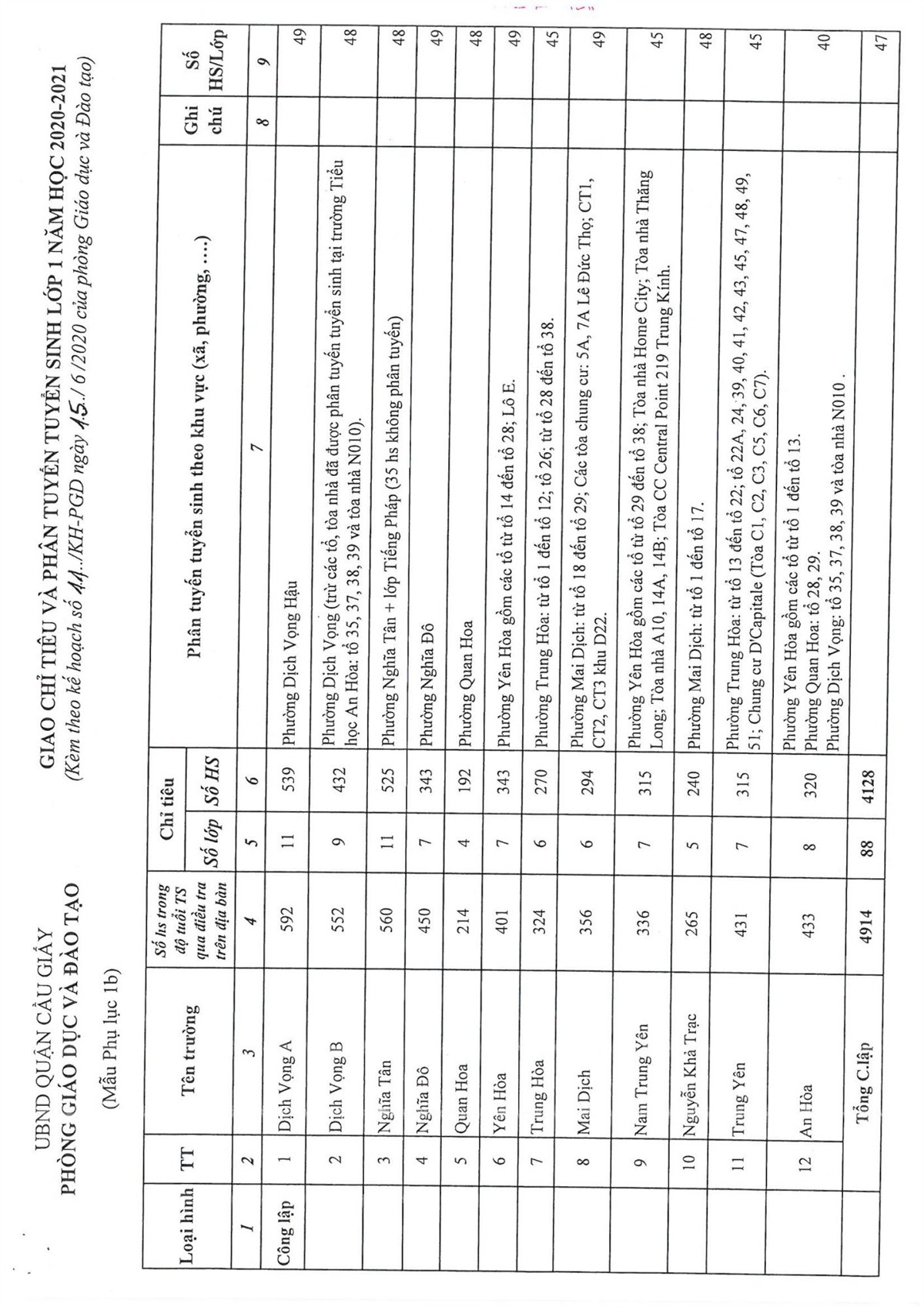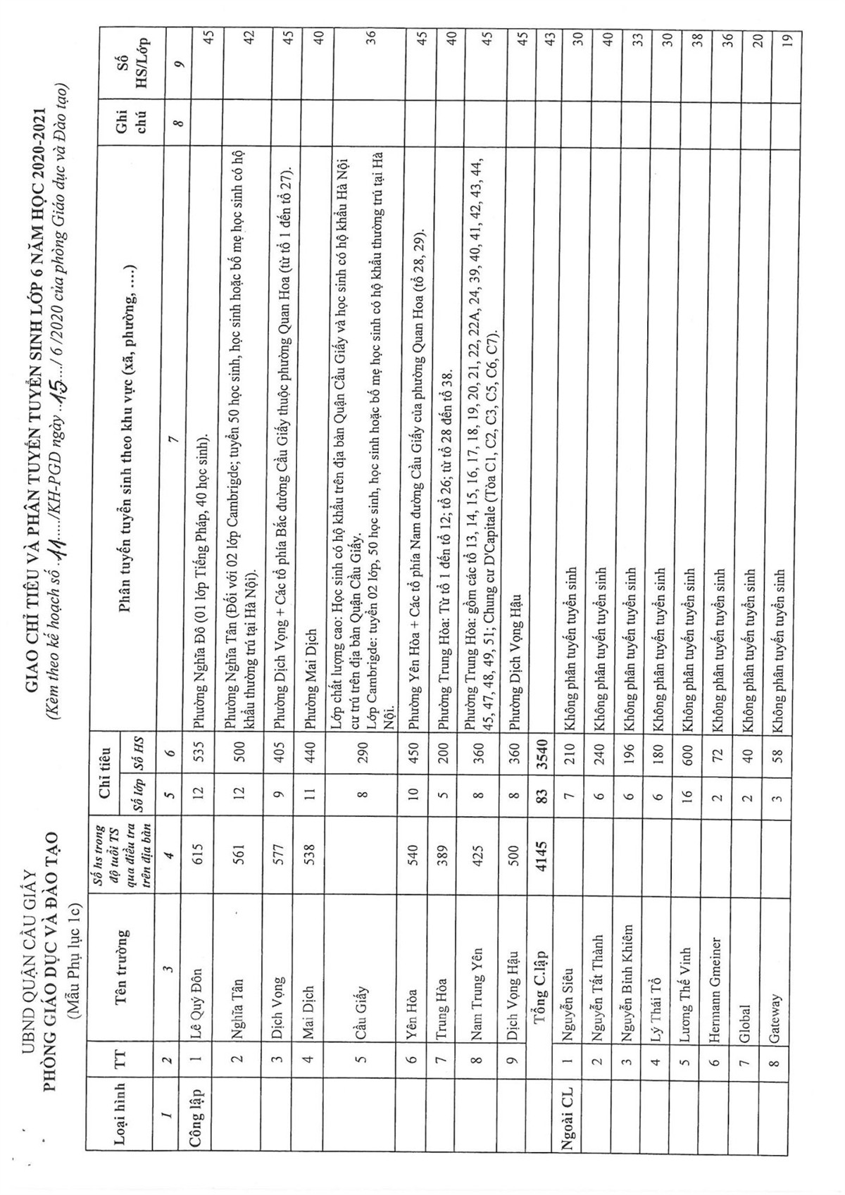 KẾ HOẠCH TUYỂN SINH NĂM HỌC 2020-2021 CỦA QUẬN CẦU GIẤY