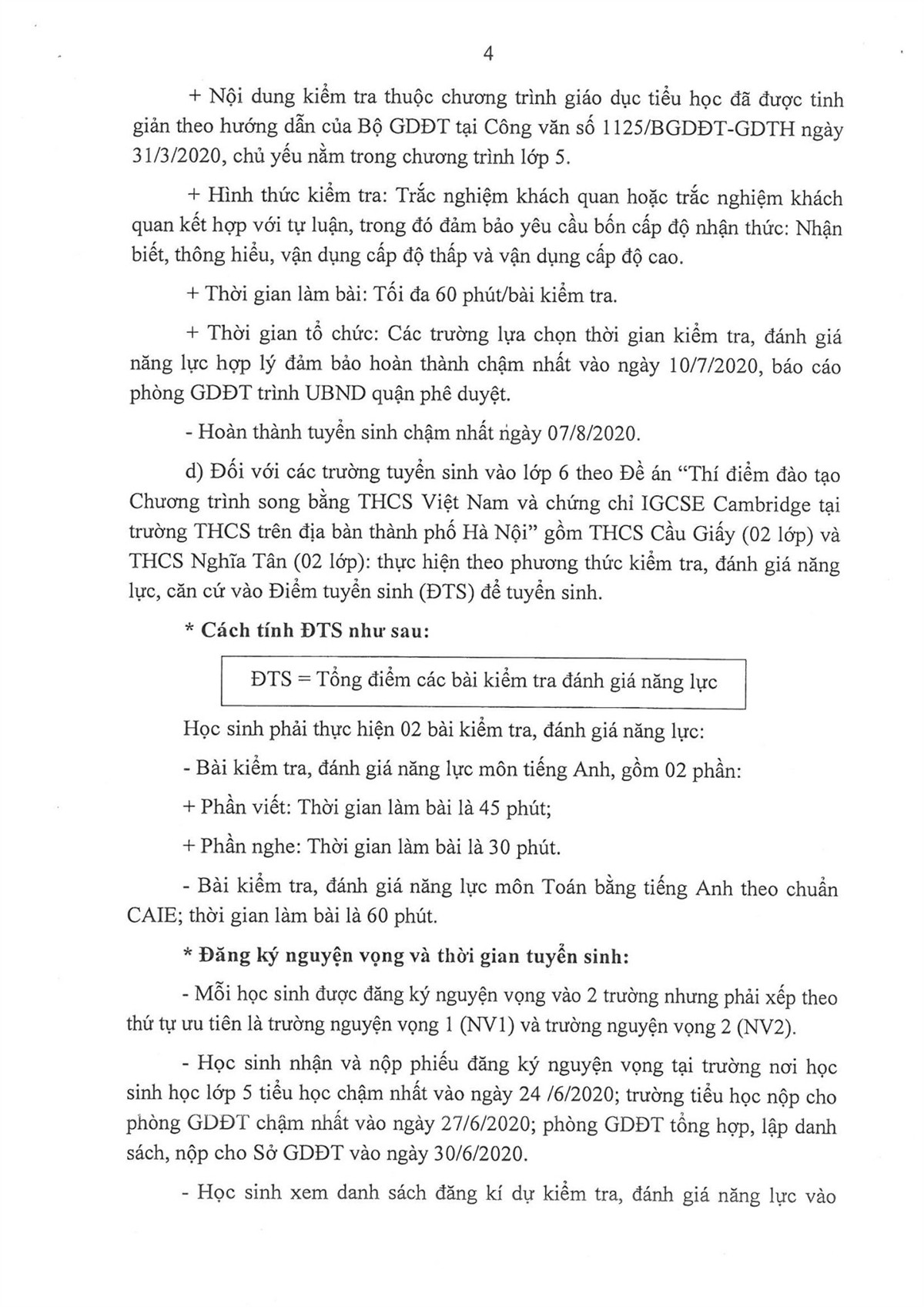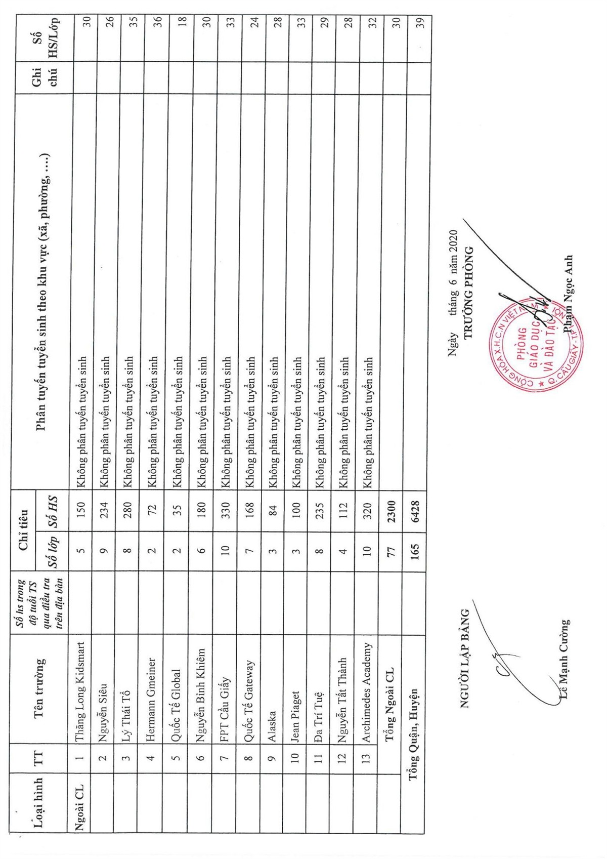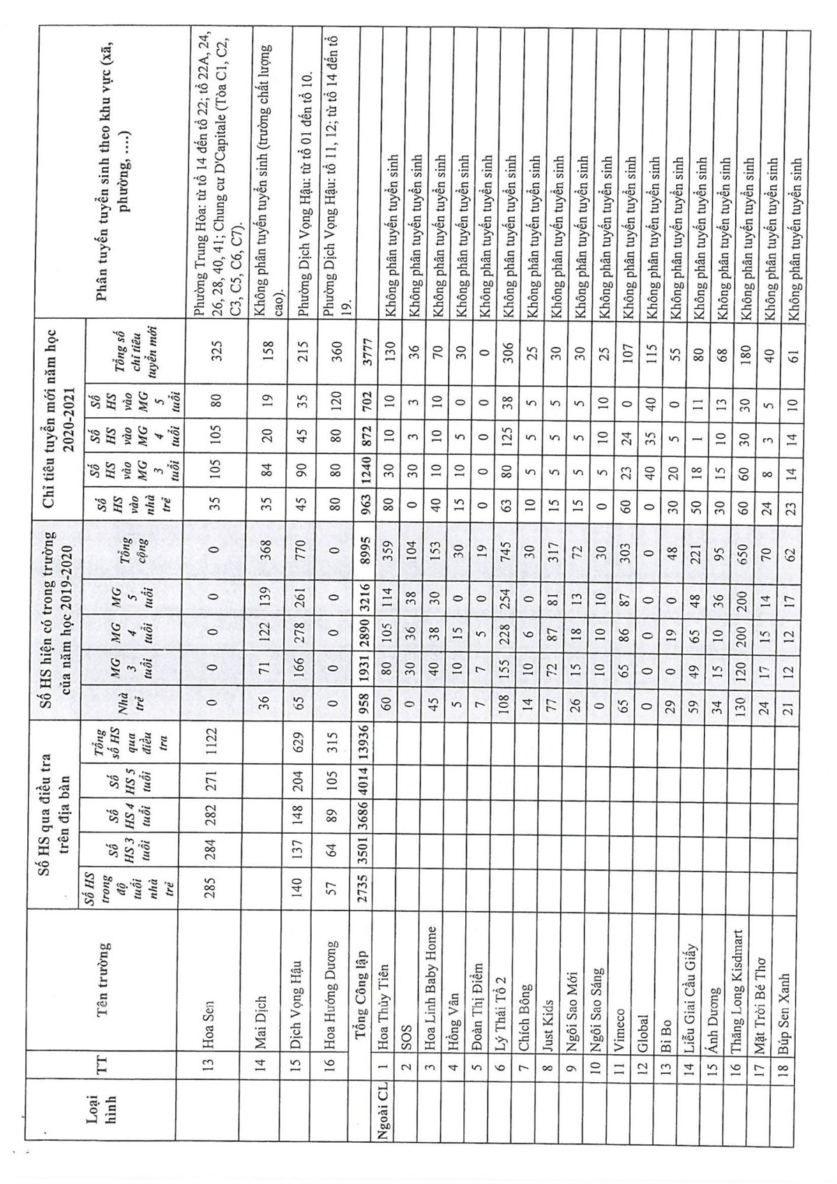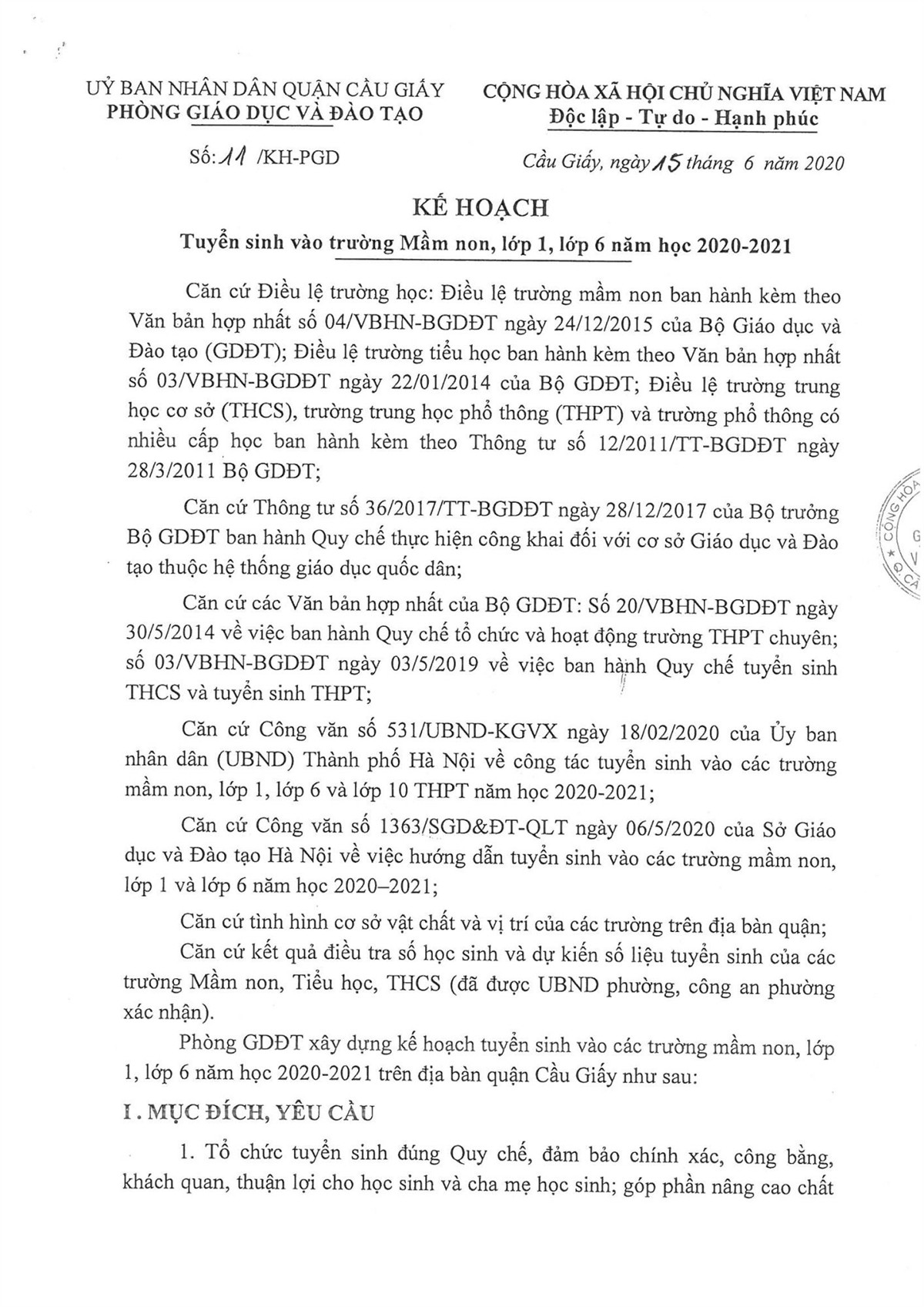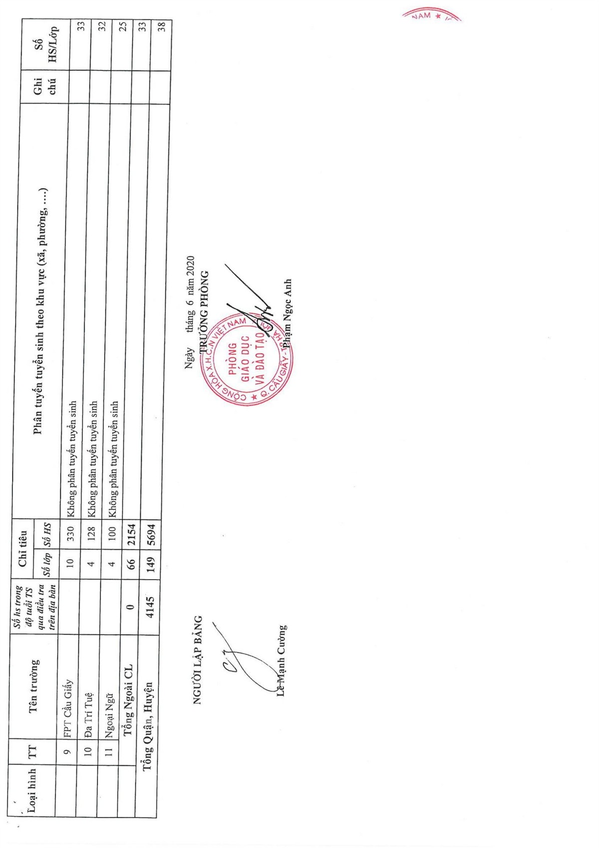 KẾ HOẠCH TUYỂN SINH NĂM HỌC 2020-2021 CỦA QUẬN CẦU GIẤY
