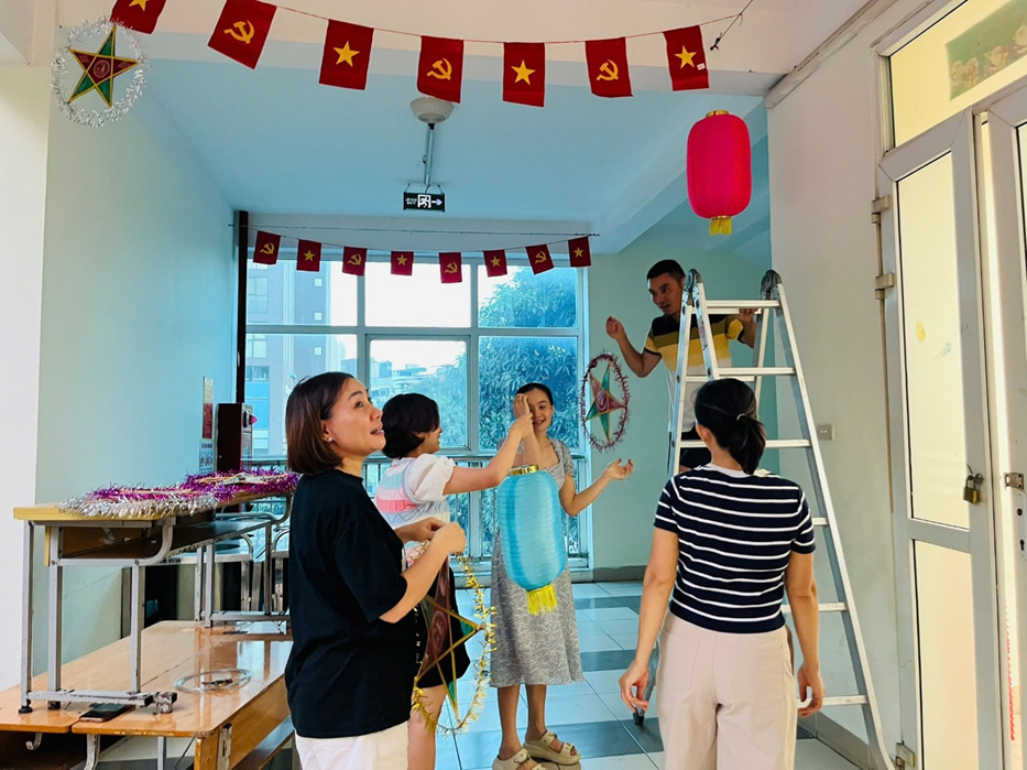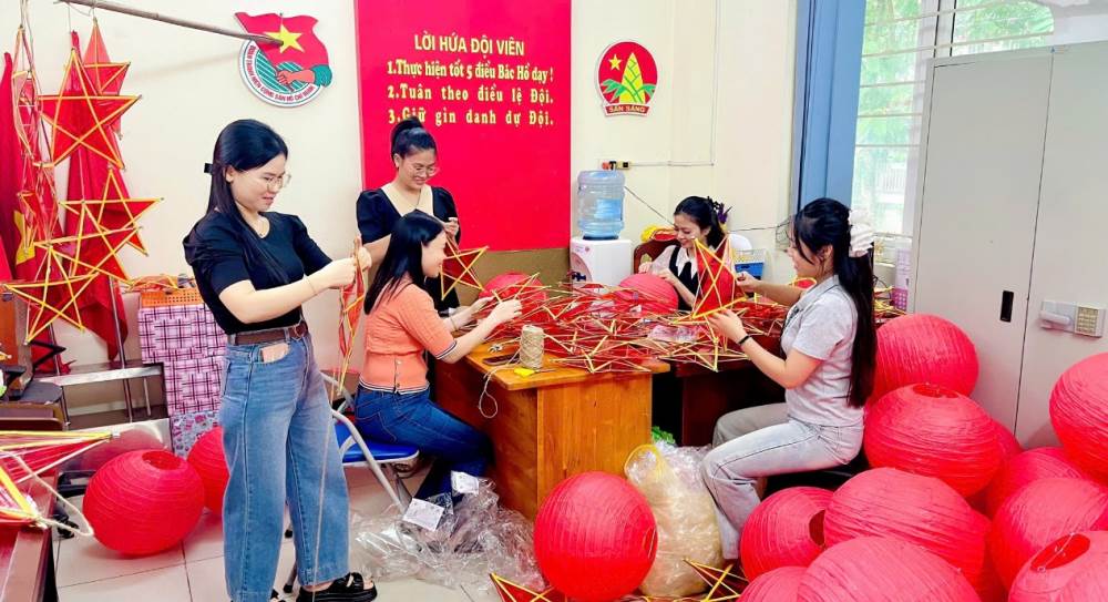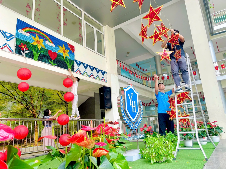 Các thầy cô, đặc biệt là đoàn viên chi đoàn, các bác bảo vệ đã lên ý tưởng và trang trí từng chiếc đèn lồng, đèn ông sao rực rỡ.
