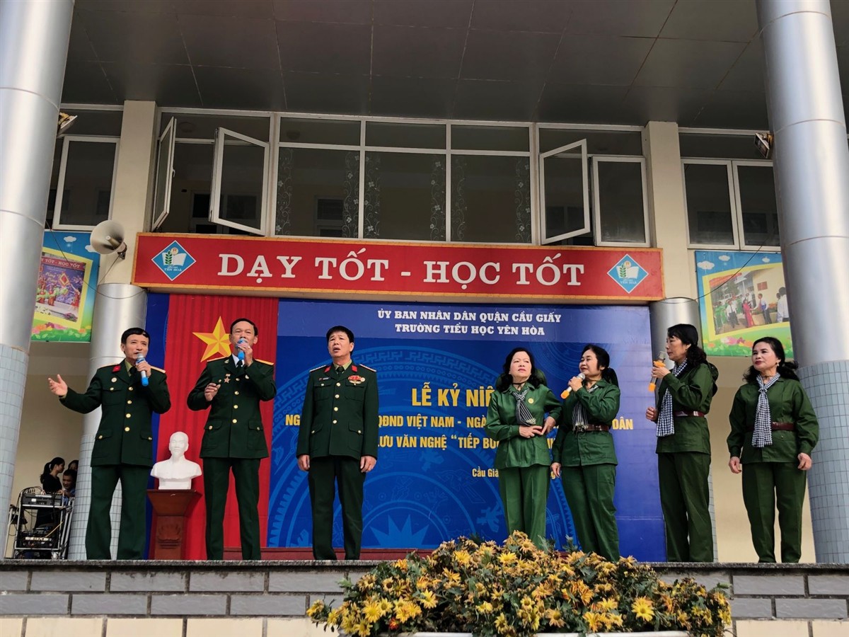 Đến dự buổi lễ có các bác cựu chiến binh Phường Yên Hòa, Ban Giám hiệu, cán bộ, giáo viên, nhân viên, cùng toàn thể các em học sinh. Ý nghĩa cao đẹp của ngày 22/12 được thể hiện sâu sắc trong lời tuyên truyền của thầy Tổng phụ trách. Lời tuyên truyền khẳng định vai trò to lớn của Quân đội nhân dân Việt Nam trong thế kỉ XX. Từ những chiến sĩ tuyên truyền giải phóng quân được trang bị đơn sơ trong những ngày đầu thành lập, đến những chiến sĩ giải phóng quân hóa thân mình thành dáng hình của đất nước trong thế kỉ XX là cả một cuộc hành trình vĩ đại đi tìm chân lí độc lập tự do của những người lính Cụ Hồ. Đất nước bị xâm lăng, quê hương bị giặc tàn phá, chính quân đội ta, chính những người lính đã dâng hiến tuổi xuân của cuộc đời mình để đem lại cho dân tộc ta nền hòa bình, độc lập.