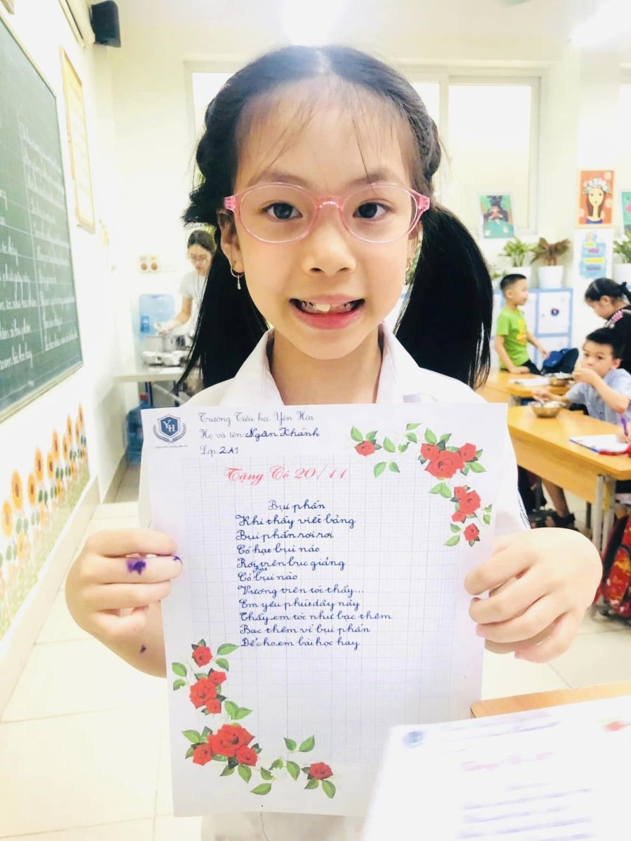 Chỉ bằng những nguyên liệu đơn giản, sẵn có như bìa cát-tông, giấy màu, hoa, lá,... cùng với các dụng cụ quen thuộc: Kéo, hồ dán, băng dính… Các bạn học sinh trường Tiểu học Yên Hòa đã khéo léo thiết kế, sáng tạo nên những bức tranh, những tấm thiệp, những giỏ hoa “siêu đặc biệt” … để dành tặng các cô giáo nhân ngày Nhà giáo Việt Nam 20/11. Những món quà này tuy không cầu kì, đắt đỏ nhưng lại đầy ý nghĩa vì đó là tất cả tâm tư, tình cảm của các học trò nhỏ dành cho thầy cô – những người cha, người mẹ thứ hai của các em.