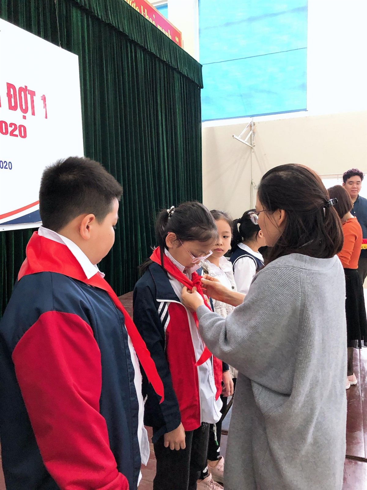 Các bạn học sinh tiêu biểu của các lớp vinh dự được các thầy cô giáo trong Ban giám hiệu và các cô chủ nhiệm trao khăn quàng đỏ.