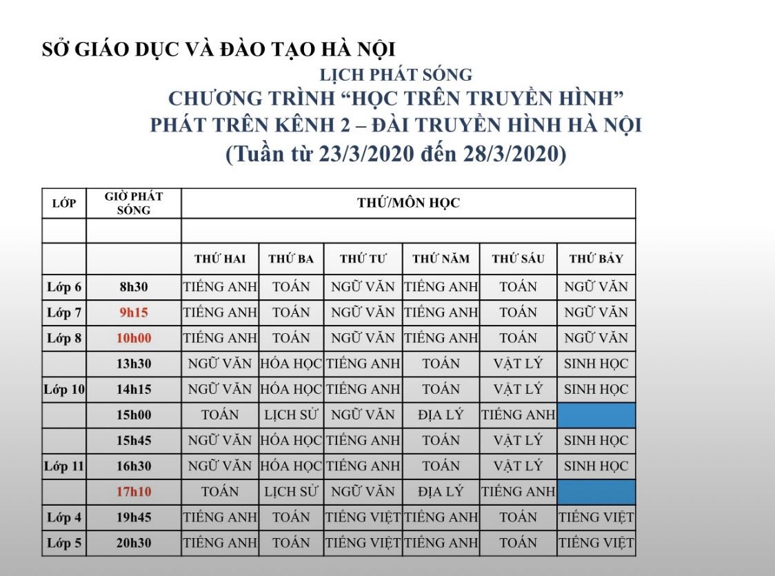 LỊCH PHÁT SÓNG CHƯƠNG TRÌNH "HỌC TRÊN TRUYỀN HÌNH" TRÊN KÊNH 2 - ĐÀI TRUYỀN HÌNH HÀ NỘI