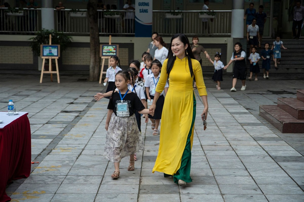 Để đón phụ huynh và các con, Trường Tiểu học Yên Hòa tạo ra những góc chụp ảnh check-in “xịn sò” giúp các con lưu lại những khoảnh khắc đáng nhớ của ngày đầu tới lớp. Các cô giáo xinh đẹp, dịu dàng trong tà áo dài thướt tha, ân cần hướng dẫn các con ngay từ ngoài cổng trường