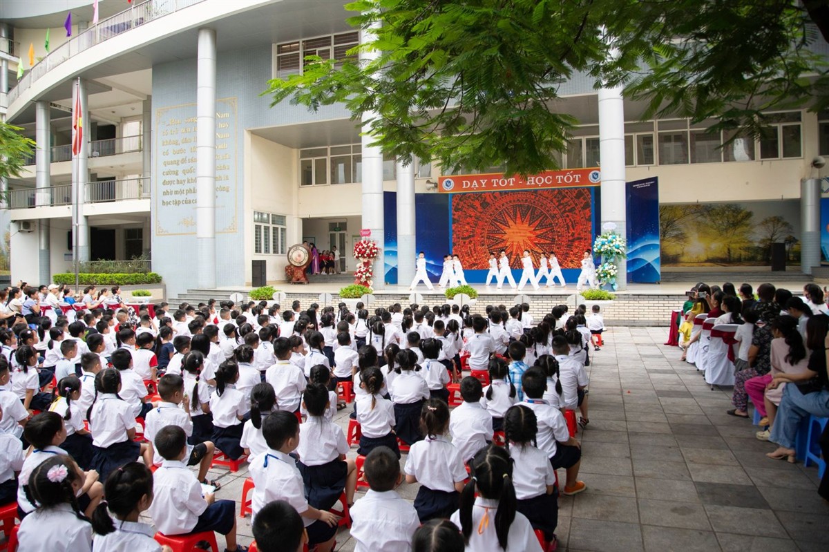 Mở đầu là những tiết mục văn nghệ sôi động, CLB Ca khúc măng non của nhà trường biểu diễn trong tràng vỗ tay của hàng trăm học sinh và phụ huynh. Ngay sau đó, chính các bạn nhỏ lớp 1 xuất hiện trên nền nhạc sôi động khiến bầu không khí vui tươi, nóng hơn, xóa dần sự e sợ, rụt rè. Âm nhạc dẫn lối con tim, những tiếng vỗ tay, tiếng hò reo, nụ cười dần xuất hiện trong đám đông. Nhiều bạn nhỏ không giấu được cảm xúc, đu đưa theo điệu nhạc.