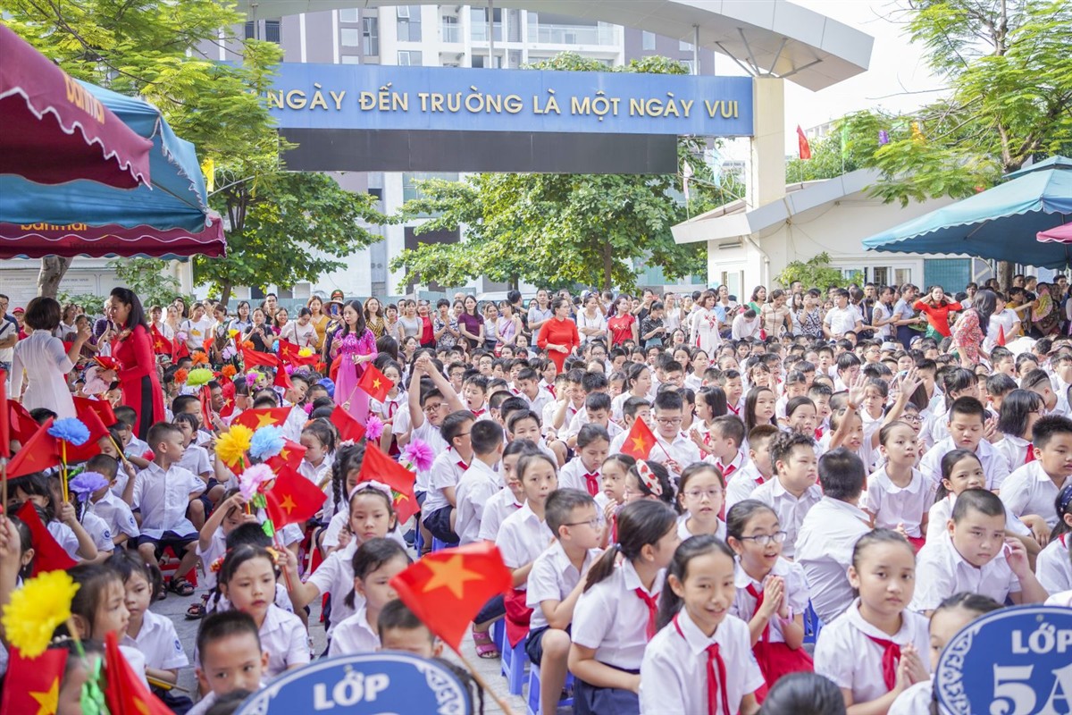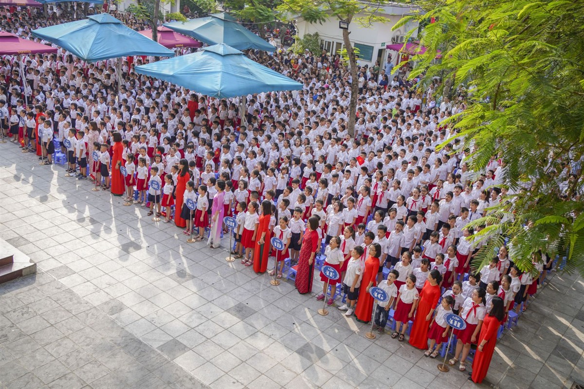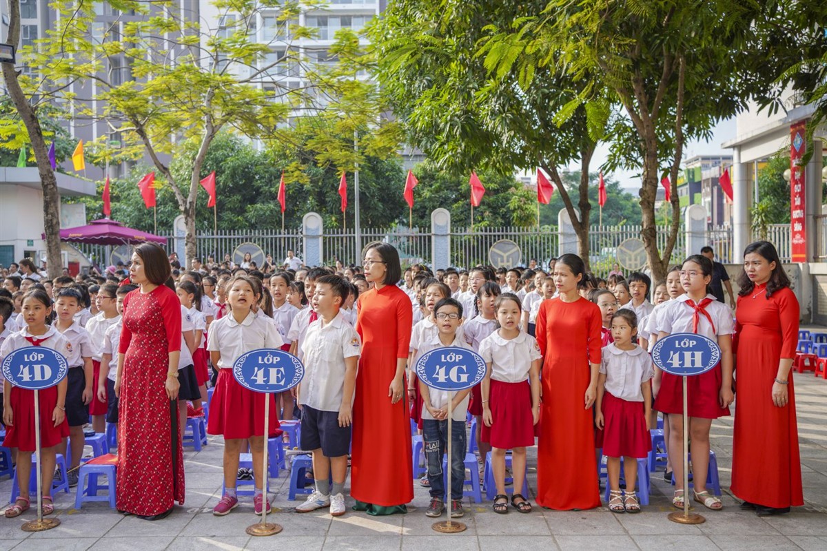 Trong tiết trời Thu dịu mát, từ sáng sớm các em học sinh đã phấn khởi, nô nức đến trường để dự lễ khai giảng. Sân trường ngập một màu đỏ của cờ và hoa. Dường như sắc đỏ đó đã khiến mọi người quên đi cảm giác se lạnh của tiết trời Thu mà chỉ cảm nhận được không khí ấm áp, vui tươi.