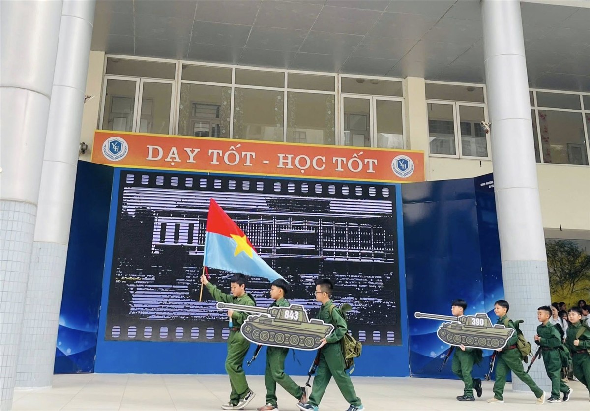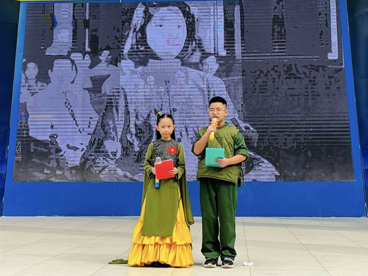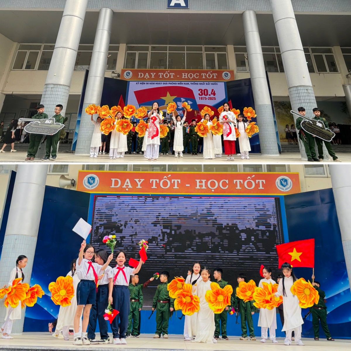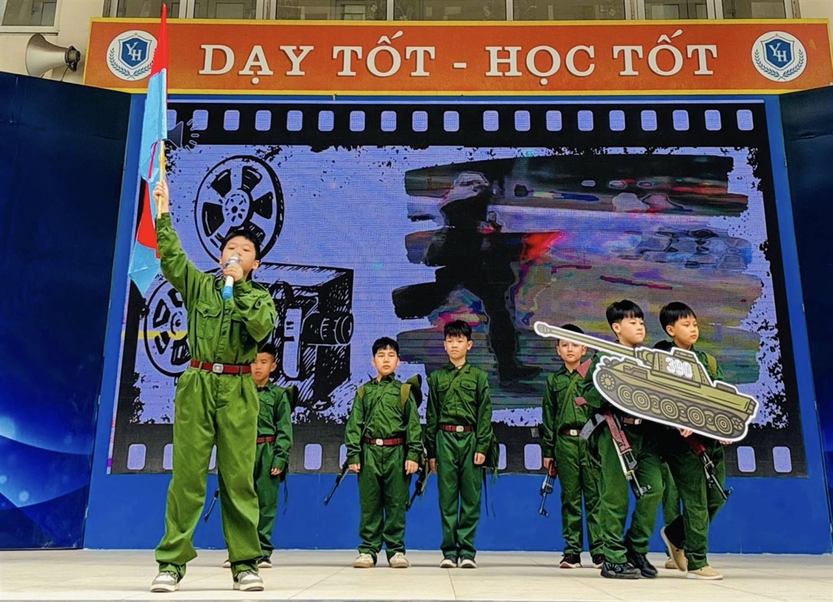 Tiết mục kể chuyện theo sách “Đại thắng mùa xuân” do học sinh khối 3 và 5 thể hiện – sân khấu hóa đầy hào hùng về cuộc Tổng tiến công và nổi dậy năm 1975.