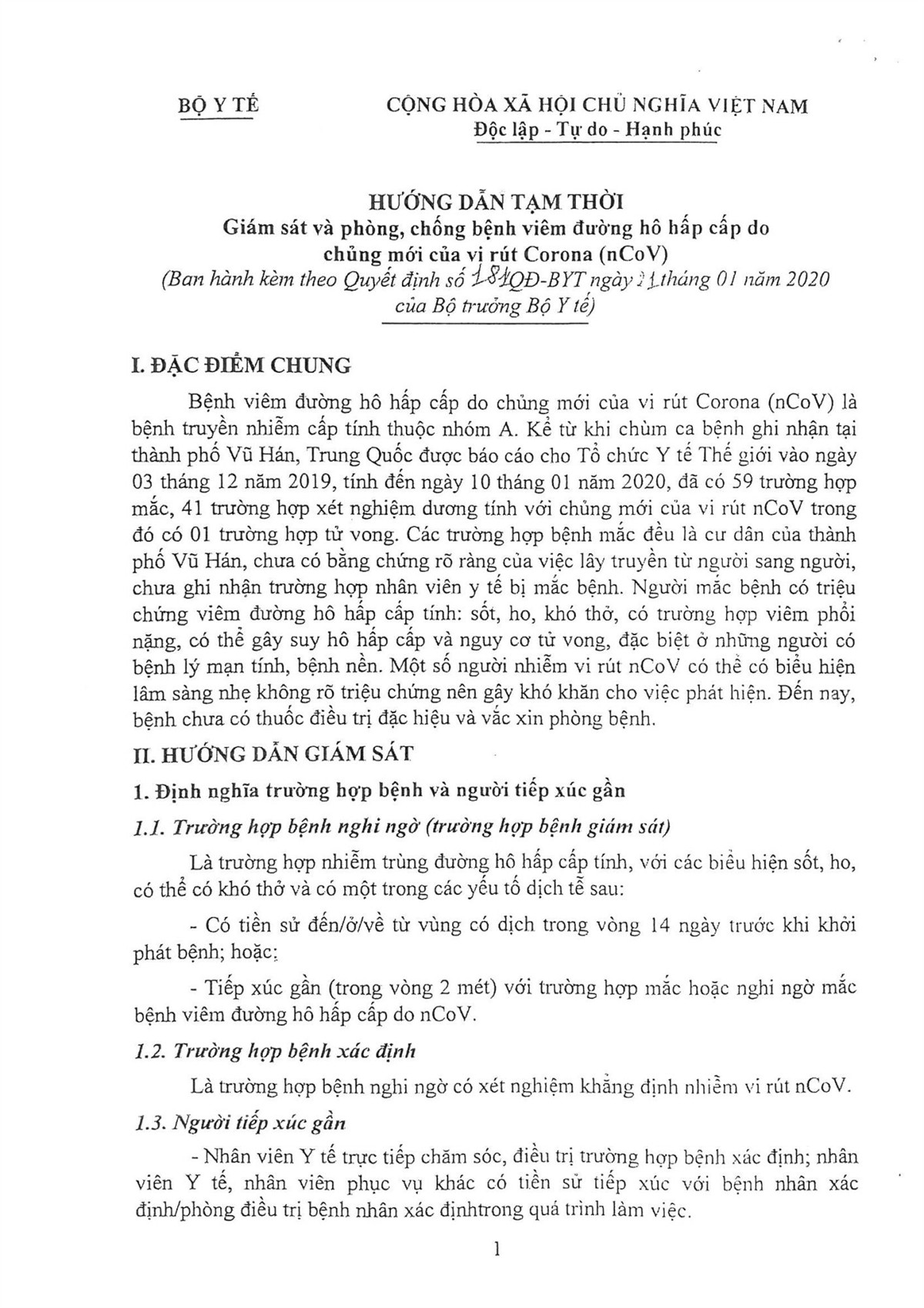 Quyết định về việc ban hành "Hướng dẫn tạm thời giám sát và phòng, chống bệnh viêm đường hô hấp cấp do chủng mới của Virus Corona (nCoV)