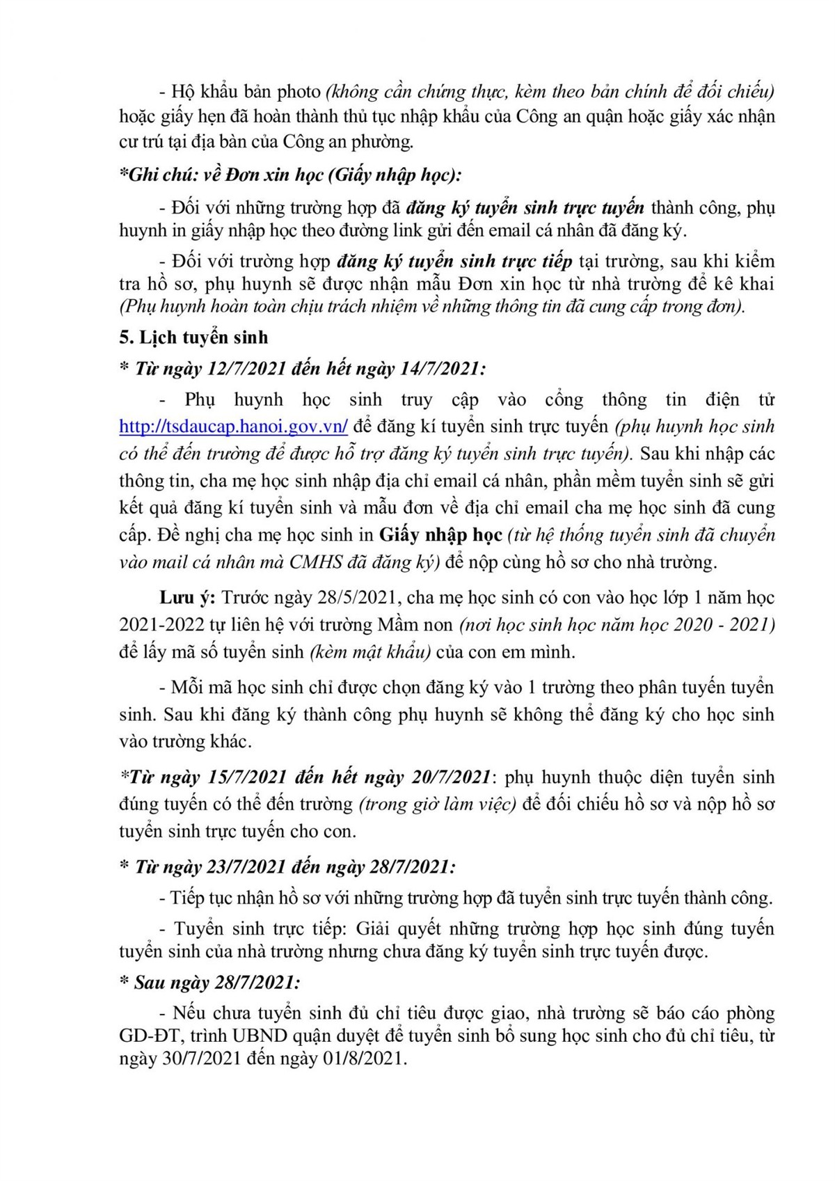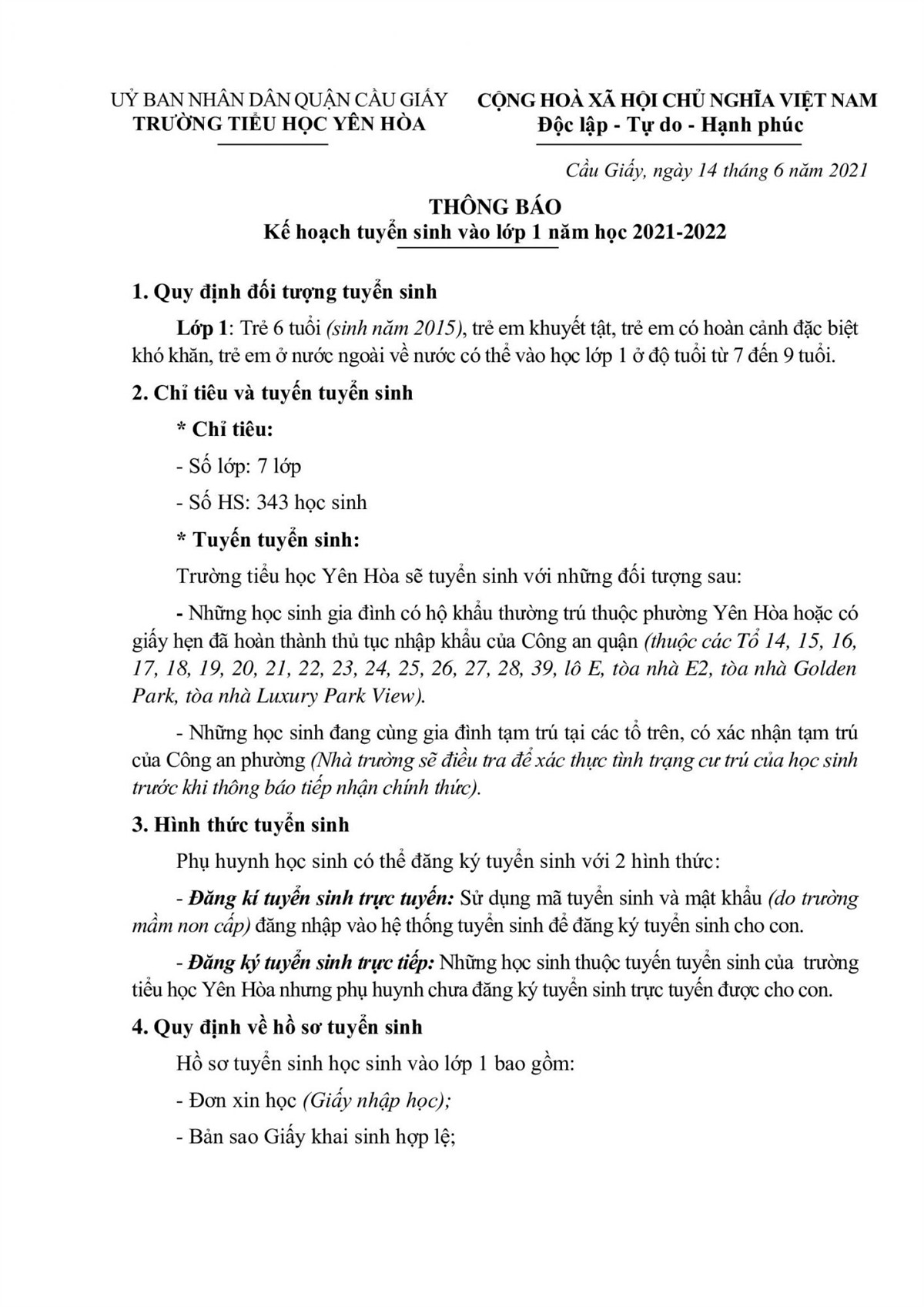 THÔNG BÁO KẾ HOẠCH TUYỂN SINH VÀO LỚP 1 NĂM HỌC 2021-2022