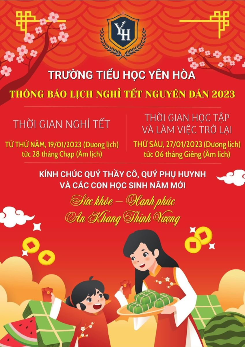 Trường Tiểu học Yên Hoà kính gửi quý phụ huynh và các em học sinh lịch nghỉ Tết Nguyên Đán 2023Kính chúc quý thầy cô,quý phụ huynh,các con học sinh và đại gia đình một năm mới bình an,vạn sự như ý