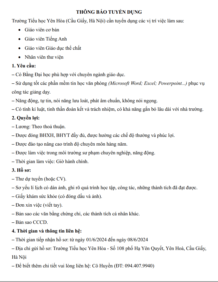 Trường Tiểu học Yên Hòa thông báo tuyển dụng: