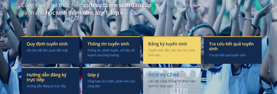 - Phụ huynh chọn vào ô Tuyển sinh vào lớp 1 năm học 2019-2020 (nếu đăng ký tuyển sinh trực tuyến trong các ngày từ 1/7 đến 3/7/2019).
