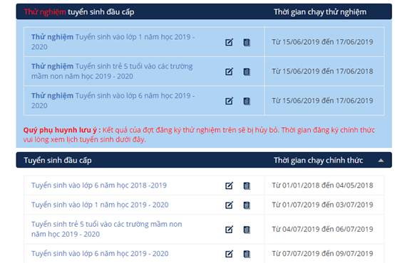 * Ghi chú: Việc đăng ký tuyển sinh thử để phụ huynh có thể nắm được các bước thực hiện khi chính thức đăng ký tuyển sinh trực tuyến cho con (em). Thông tin đăng ký thử của học sinh sẽ bị hệ thống tuyển sinh của Thành phố xóa sau ngày 17/6/2019 để chuẩn bị cho việc đăng ký chính thức.