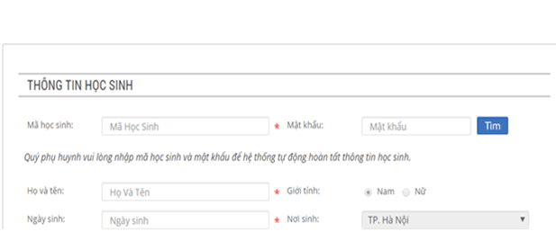 CMHS nhập mã số và mật khẩu đăng ký tuyển sinh, nhấn vào nút Tìm hoặc Enter để lấy thông tin học sinh lên biểu mẫu; sau đó hoàn thiện các thông tin cần thiết vào biểu mẫu trực tuyến.