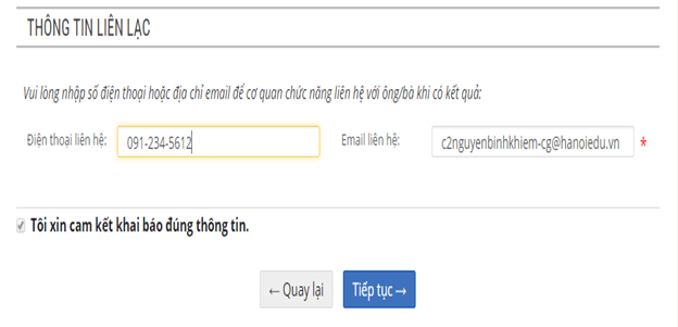 Sau khi điền đầy đủ thông tin vào biểu mẫu trực tuyến, CMHS nhấn nút Tiếp tục để sang bước tiếp theo.
