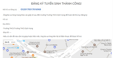 Sau khi CMHS gửi thông tin xác nhận đăng ký tuyển sinh trực tuyến, hệ thống sẽ thông báo ĐĂNG KÝ TUYỂN SINH THÀNH CÔNG, hiển thị thông tin đăng ký tuyển sinh và mã hồ sơ đăng ký của học sinh, CMHS nhấn nút Hoàn tất để hệ thống kết thúc và gửi thông tin vào hòm thư điện tử (email) liên hệ.