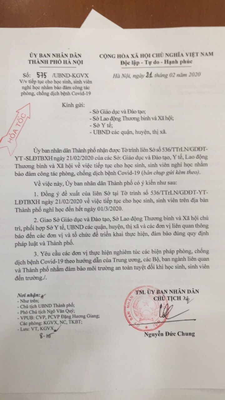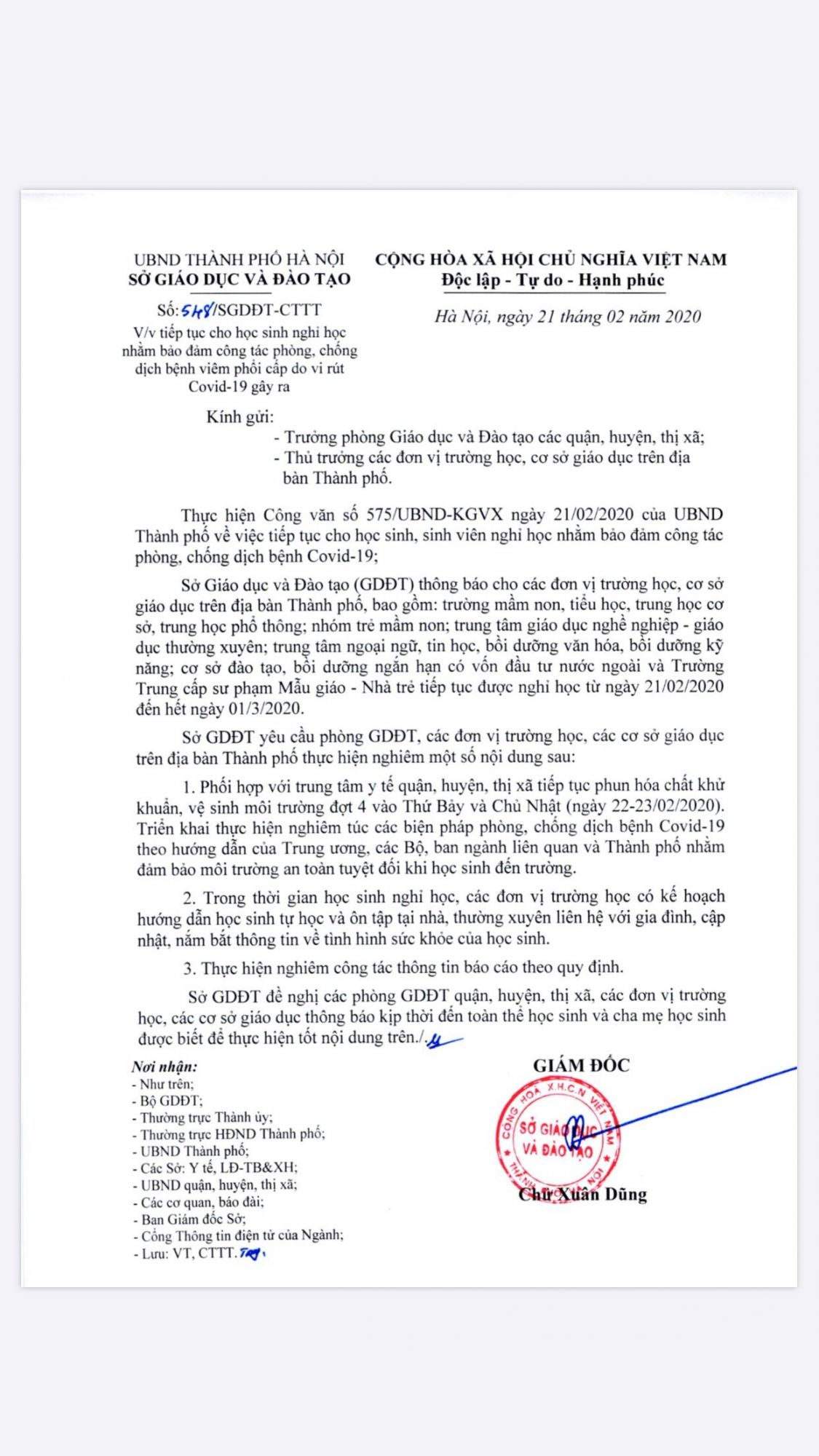 Thông báo về việc tiếp tục cho Học sinh nghỉ học nhằm bảo đảm công tác phòng chống dịch bệnh do virus Covid 19.