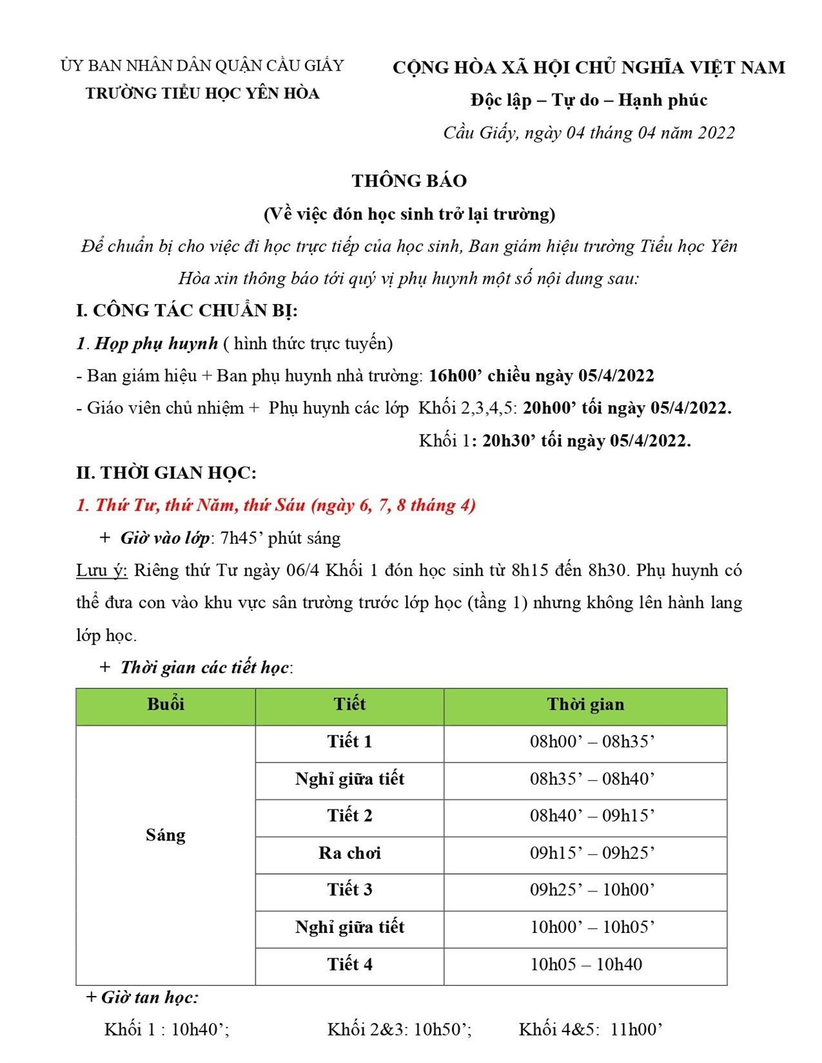 Thực hiện chỉ đạo của UBND TP. Hà Nội và Sở GD&ĐT, học sinh trên địa bàn thành phố sẽ quay trở lại trường học trực tiếp từ ngày thứ Tư (06/4/2022). Nhà trường kính gửi tới quý phụ huynh và các em học sinh THÔNG BÁO chi tiết dưới đây.