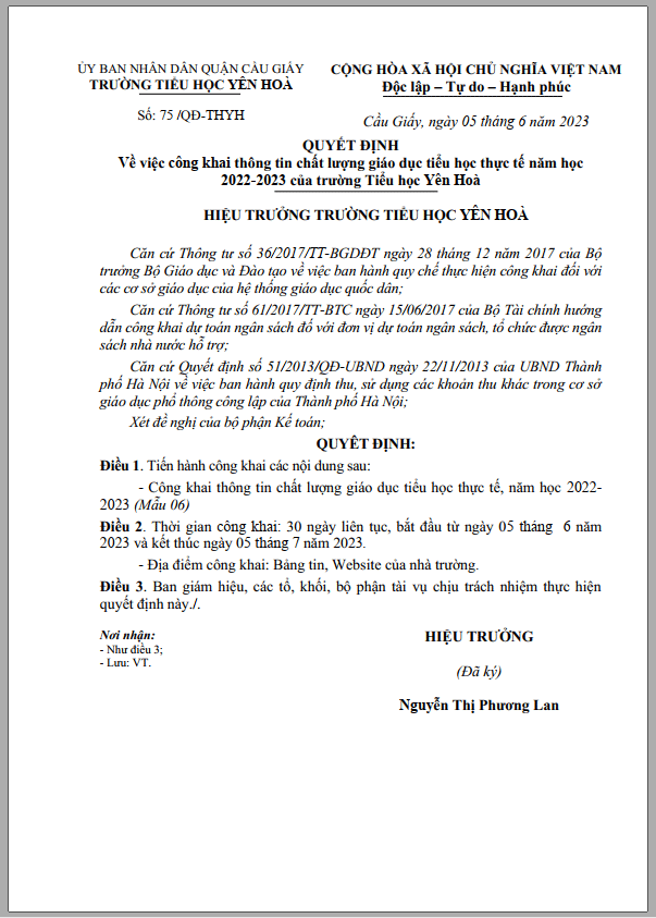 THYH - QUYẾT ĐỊNH CÔNG KHAI THÔNG TIN CHẤT LƯỢNG GIÁO DỤC NĂM HỌC 2022-2023