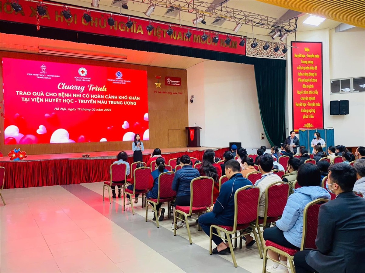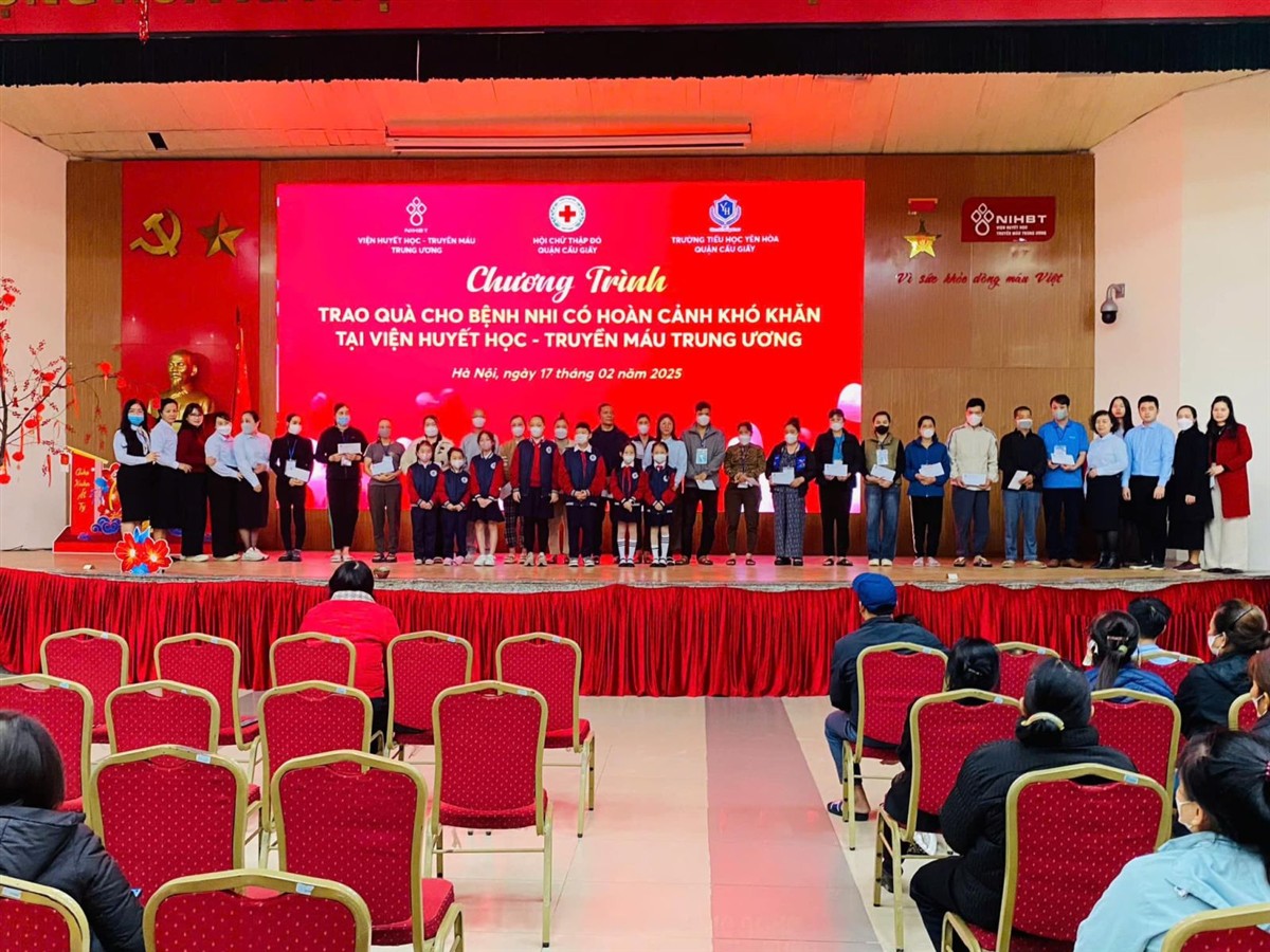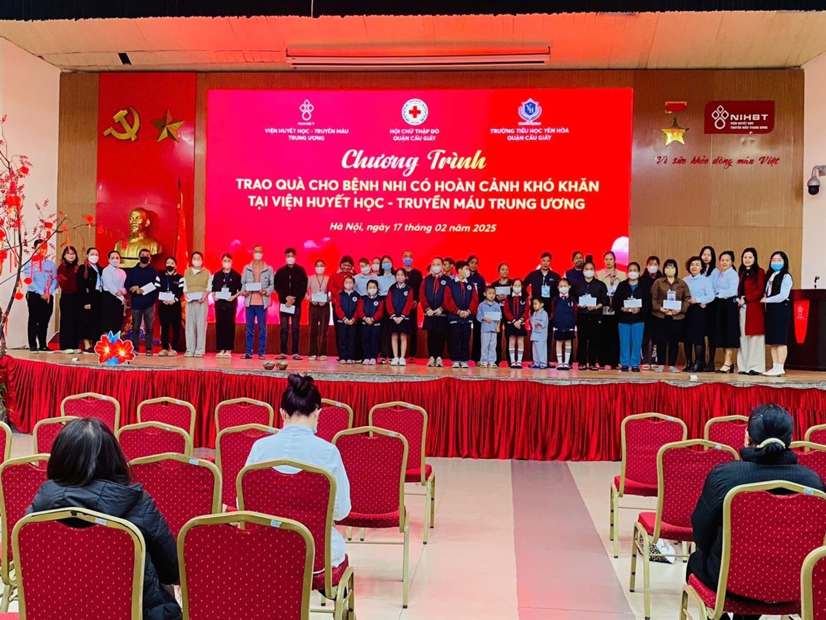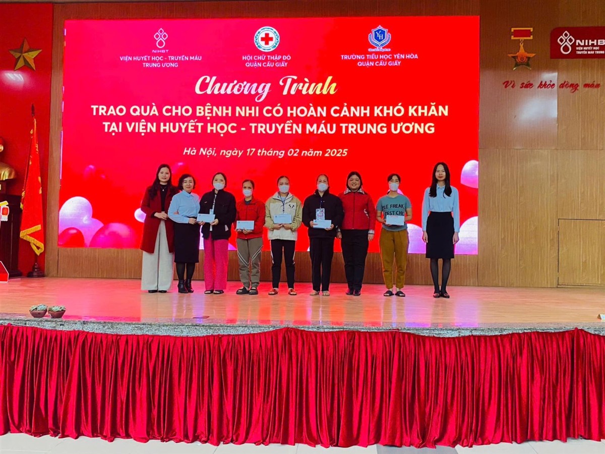 Với toàn bộ số tiền thu được từ các dự án “Lì xì yêu thương”, “Vườn hoa xuân”, “Tủ sách nhân ái” và "Gian hàng hội chợ xuân" là 70.000.000 đồng, chiều ngày 17/02/2025, phối hợp với Hội Chữ thập đỏ Quận Cầu Giấy do bà Bùi Thị Lan Phương - Chủ tịch Hội Chữ thập đỏ Quận Cầu Giấy đại diện, đại diện Ban Giám hiệu, giáo viên, nhân viên, học sinh và cha mẹ học sinh nhà trường đã có mặt tại Viện Huyết học – Truyền máu Trung ương để trao tận tay những món quà nhỏ tới gia đình các bệnh nhi có hoàn cảnh khó khăn đang điều trị tại viện. Đây là tình cảm ấm áp gửi gắm sự sẻ chia chân thành cùng những lời chúc, lời động viên tới các bạn nhỏ kém may mắn. Hi vọng các em sẽ thật mạnh mẽ, sớm chiến thắng bệnh tật để trở về với gia đình, thầy cô và bạn bè! Nhận được món quà, các gia đình bệnh nhi không nén được nỗi xúc động.