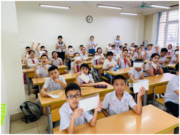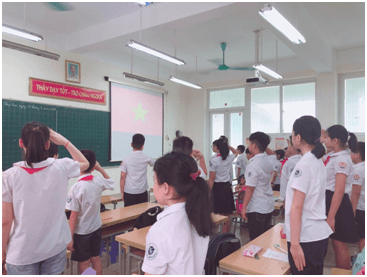 Những bài hát thiếu nhi tươi vui vang khắp sân khiến bầu không khí thêm náo nức. Giờ chào cờ hôm nay cũng thật đặc biệt! Giáo viên và học sinh của tất cả các lớp đều thực hiện nghi lễ thiêng liêng này tại phòng học của mình. Tuy số học sinh đông, các lớp học ở các tầng và vị trí khác nhau nhưng tất cả đều đồng loại thực hiện theo đúng hiệu lệnh của thầy Tổng phụ trách.